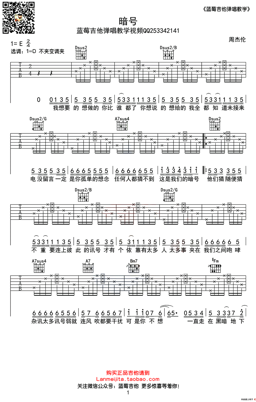 曲谱介绍: 暗号吉他谱_周杰伦_《暗号》D调简单版弹唱谱_高清六线谱分享,《暗号》是周杰伦演唱的一首歌曲,由周杰伦作曲。这首歌的歌词使用了无线电的术语,如“杂讯”“干扰”“信号弱”等来强化这一主题,是一首有传唱度和柔性的作品。不管是描述情人之间的开心、不快都好,还是针对一些生活中的小细节进行描述,能让听歌的人勾起一些细小的回忆,而这些回忆也正是刺痛人心之处,仿佛体现了周杰伦的心声。