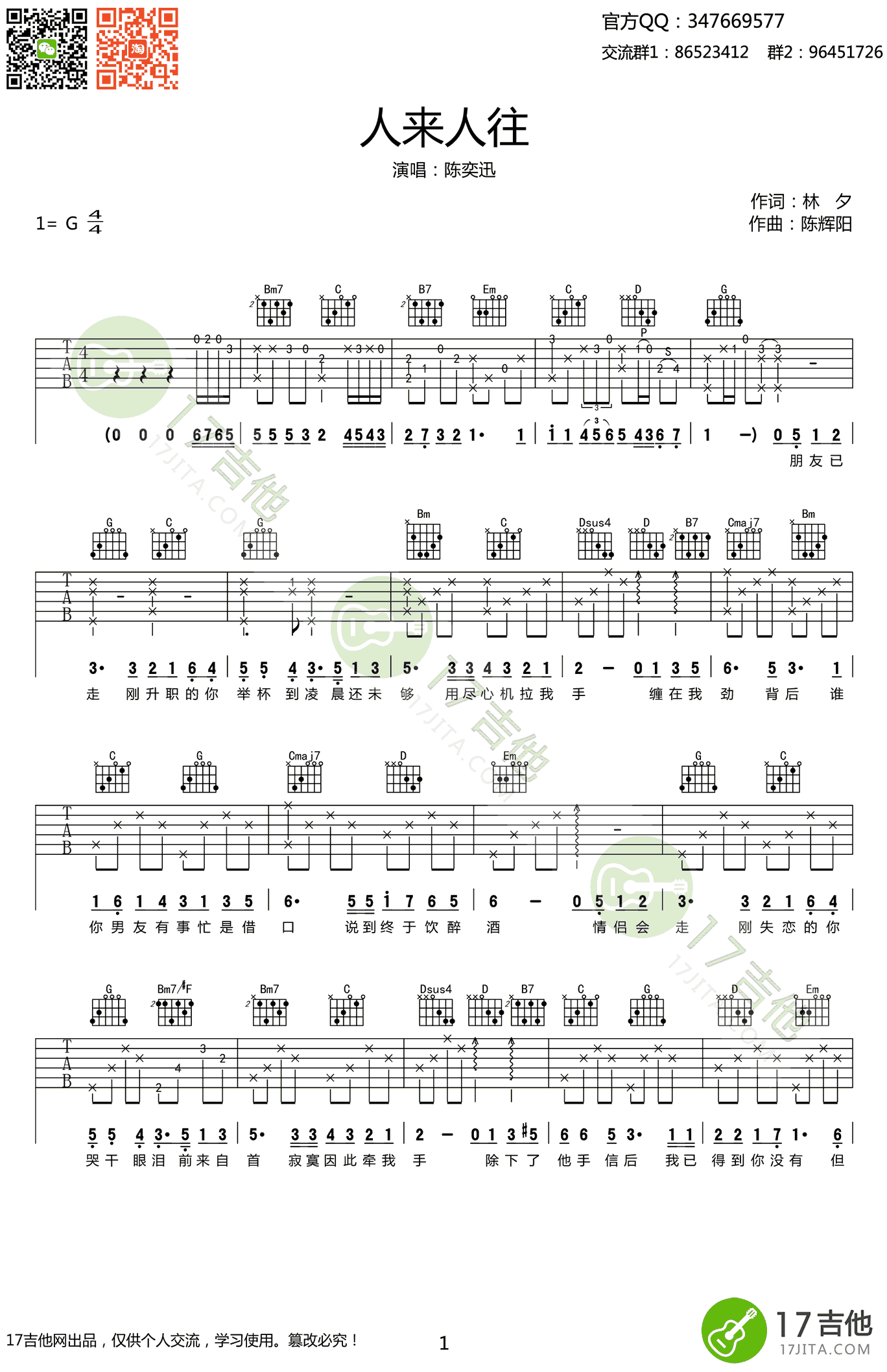 曲谱介绍: 《人来人往》吉他谱_陈奕迅_G调原版弹唱谱_高清六线谱分享,《人来人往》是由林夕作词,陈奕迅演唱的一首歌,这又是一首林夕写给刚失恋的人的歌,教他们如何走出阴影,告诉他们的身边还是有很多关心的人。