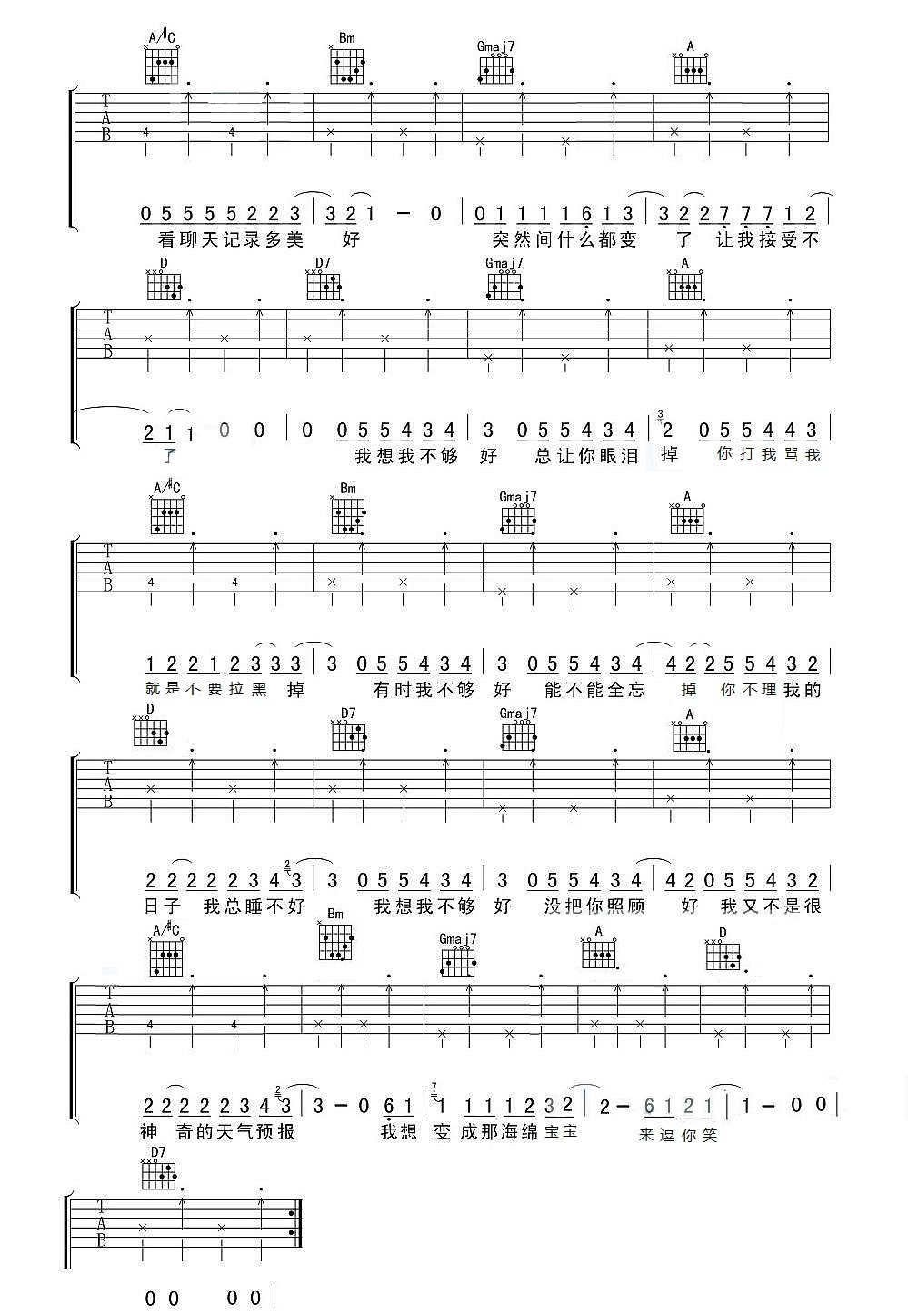 曲谱介绍: 《我想我不够好》吉他谱_回音哥_D调原版弹唱谱_高清六线谱分享,《我想我不够好》是由回音哥演唱的一首甜甜的歌曲。今天一天你没理我,心情变得超级糟糕,我真的没想跟你吵,请你把坏情绪,统统都忘掉。 此版本的曲谱来源于网络搜集,版权归原作者所有。歌曲原调为E调,这里采用了D调指法根据原版进行编配,演唱时夹变调夹2品回到原调。这首歌有一定难度,一个闷音技巧,加上一个A/#C和弦,节奏型都比较简单。 《我想我不够好》吉他谱_回音哥_D调原版弹唱谱_高清六线谱1: