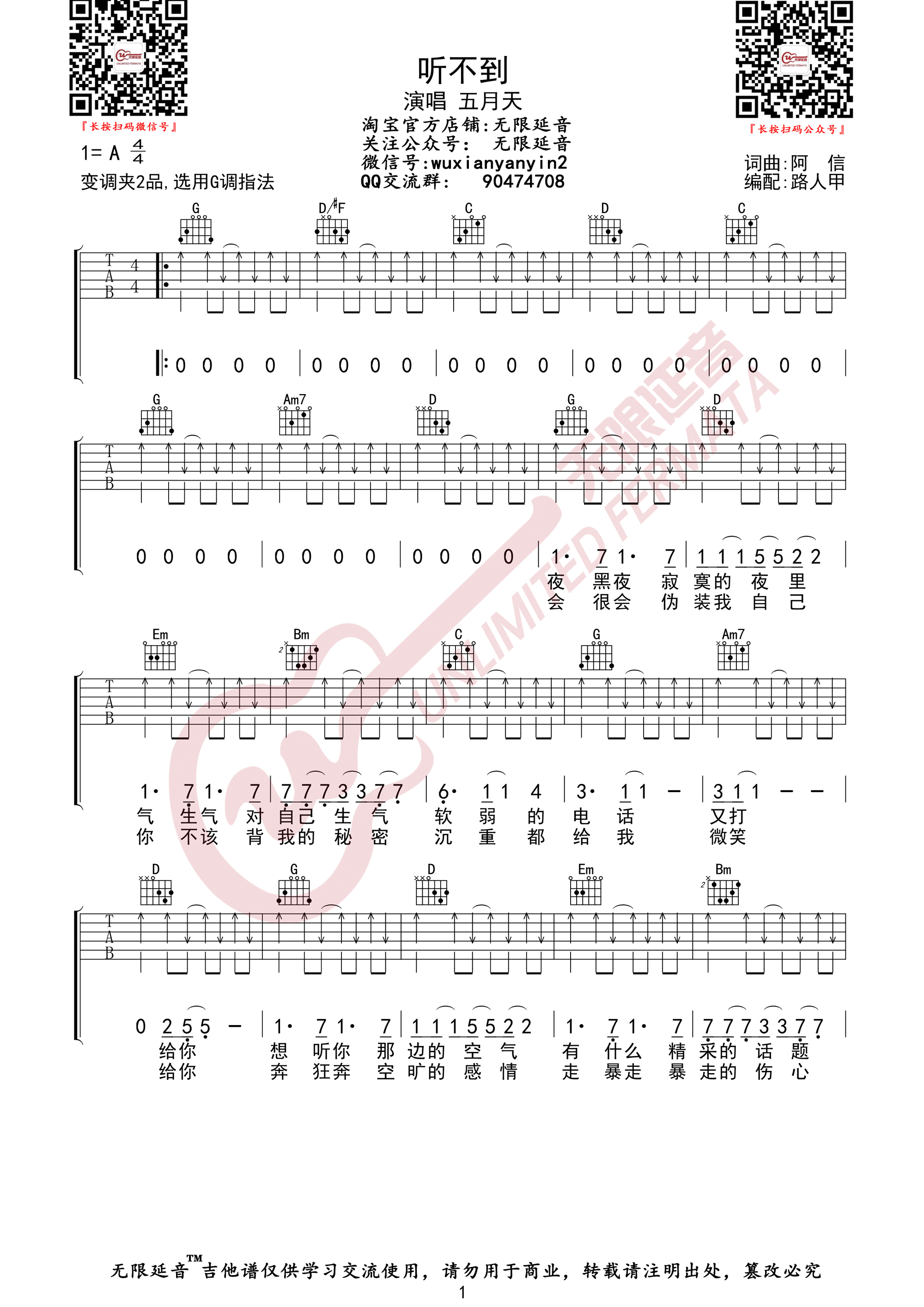 曲谱介绍: 听不到吉他谱_五月天_《听不到》G调弹唱六线谱_高清图片谱分享,《听不到》是一首五月天演唱的歌曲,这首歌的原唱是梁静茹。这首歌不止五月天翻唱过,还有很多歌手也翻唱过,但个人认为五月天翻唱的版本最好听,这应该跟他们多年累计下来的演唱经验和非常棒的唱功有很大关系。