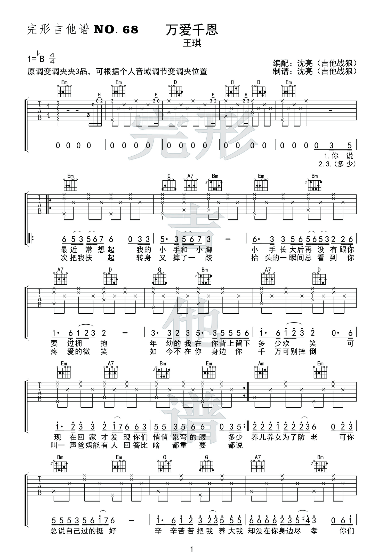 曲谱介绍: 《万爱千恩》吉他谱_王琪_G调原版弹唱六线谱_高清图片谱分享,《万爱千恩》是王琪创作并演唱的一首歌,这首歌的主要内容是感恩父母,希望父母永远不老,渴望父母身体永远好,牵挂担忧着父母的喜乐安危,让我们能再多一点时间陪伴孝敬在左右。 此版本的曲谱来源于完形吉他扒谱制谱,歌曲原调为降B调,这里采用G调指法根据原版进行编配,演唱时夹变调夹3品回到原调。前奏部分有一定难度,主要是把击弦和勾弦练熟,后面的节奏型都比较简单。 《万爱千恩》吉他谱_王琪_G调原版弹唱六线谱_高清图片谱1: