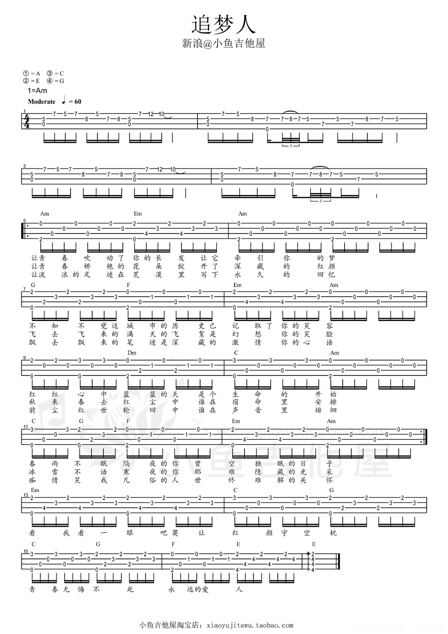 曲谱介绍: 凤飞飞《追梦人》_A调尤克里里谱