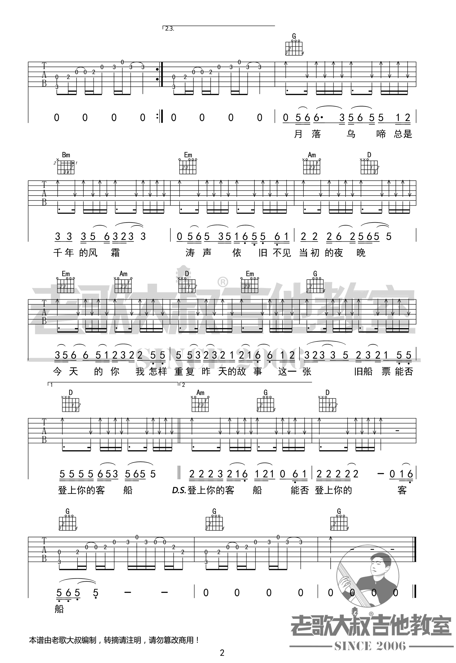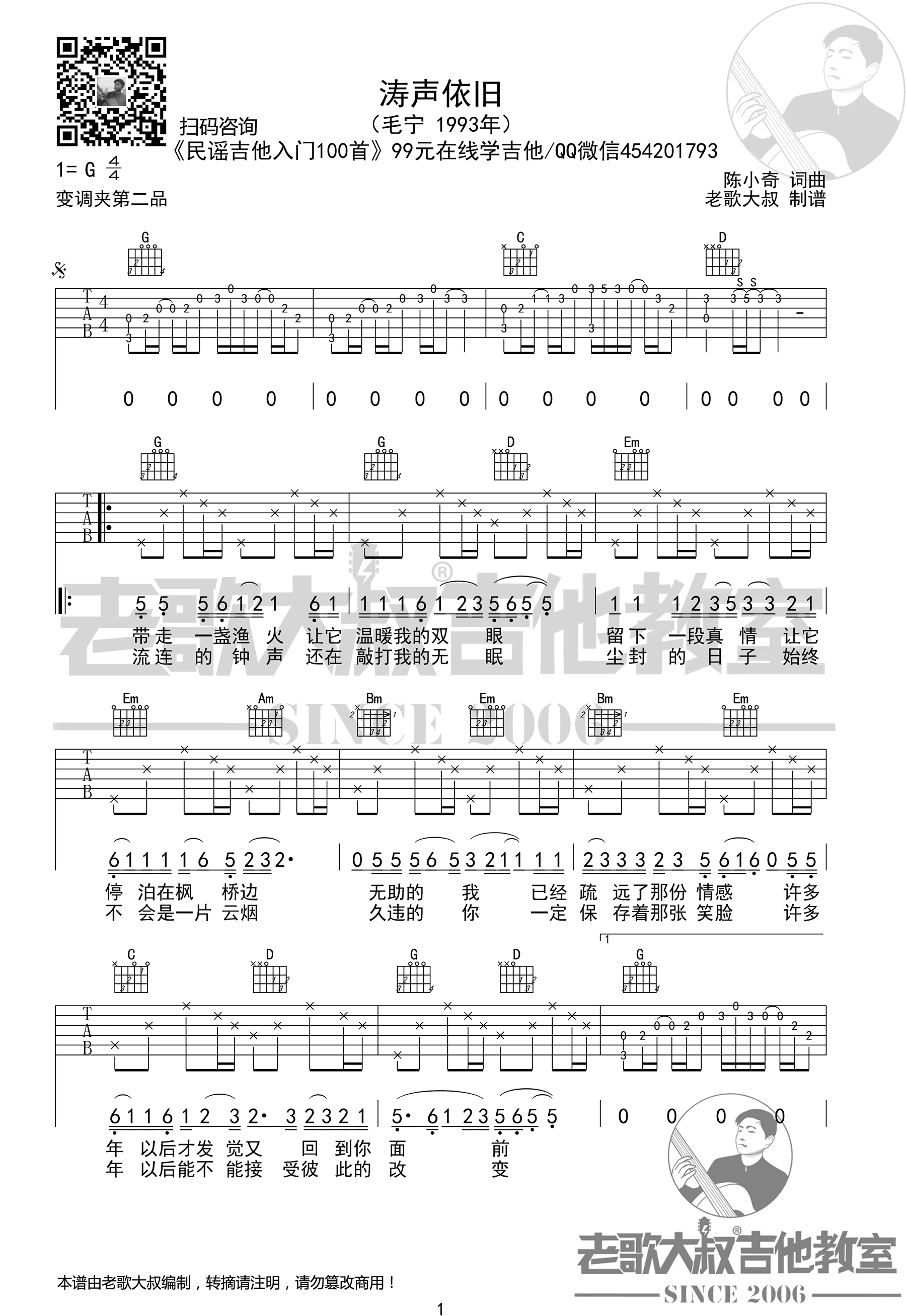 曲谱介绍: 《涛声依旧》吉他谱_毛宁_G调原版弹唱六线谱_高清图片谱分享,《涛声依旧》是由毛宁演唱的一首经典老歌,这也是毛宁的成名曲。这首歌曲非常优美、意境深远,蕴涵着一种淡淡的温婉和忧愁。这是一首可以引起很多人共鸣的好歌,它以张继的诗歌《枫桥夜泊》为蓝本,将古诗词的神韵意境完美地融入到了现代人的口吻和情怀中。“带走一盏渔火,让它温暖我的双眼,留下一段真情,让它停泊在枫桥边”,既是歌词,也是古今结合的现代诗 。
