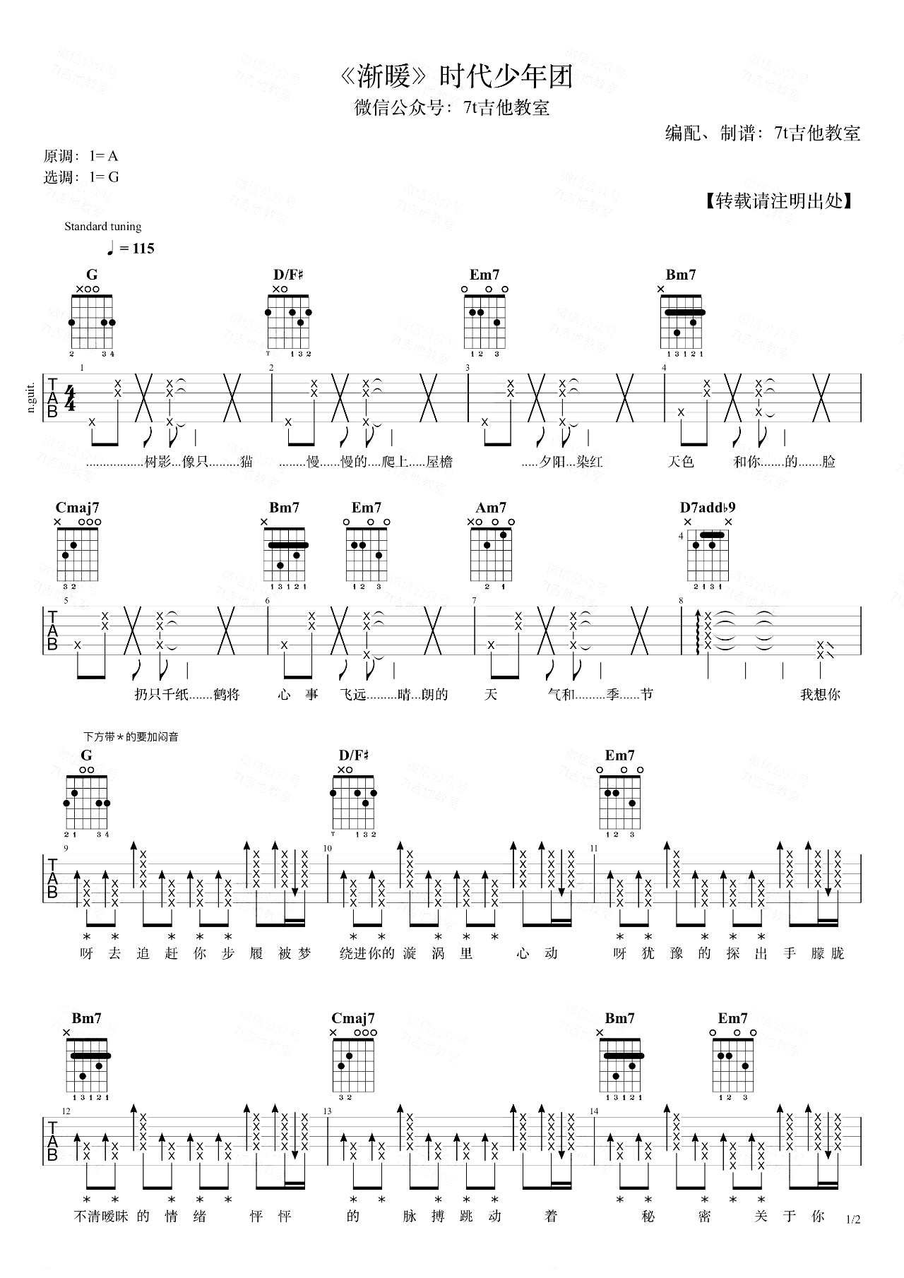 曲谱介绍: 渐暖吉他谱,时代少年团演唱,原调是A大调,用的是G大调的指法来编配,《渐暖》吉他弹唱演示视频里是降半音调弦,没有使用变调夹。想弹原调的琴友们需要用标准音调弦夹2品。这首歌的和弦进行,主歌以卡农走向为主,用到了一些斜杠和弦来连接低音,比如D/F#用来连接G和Em7;副歌以4536251为主,其中用到了一些副属和弦,比如G7和E7,增加了离调的感觉。