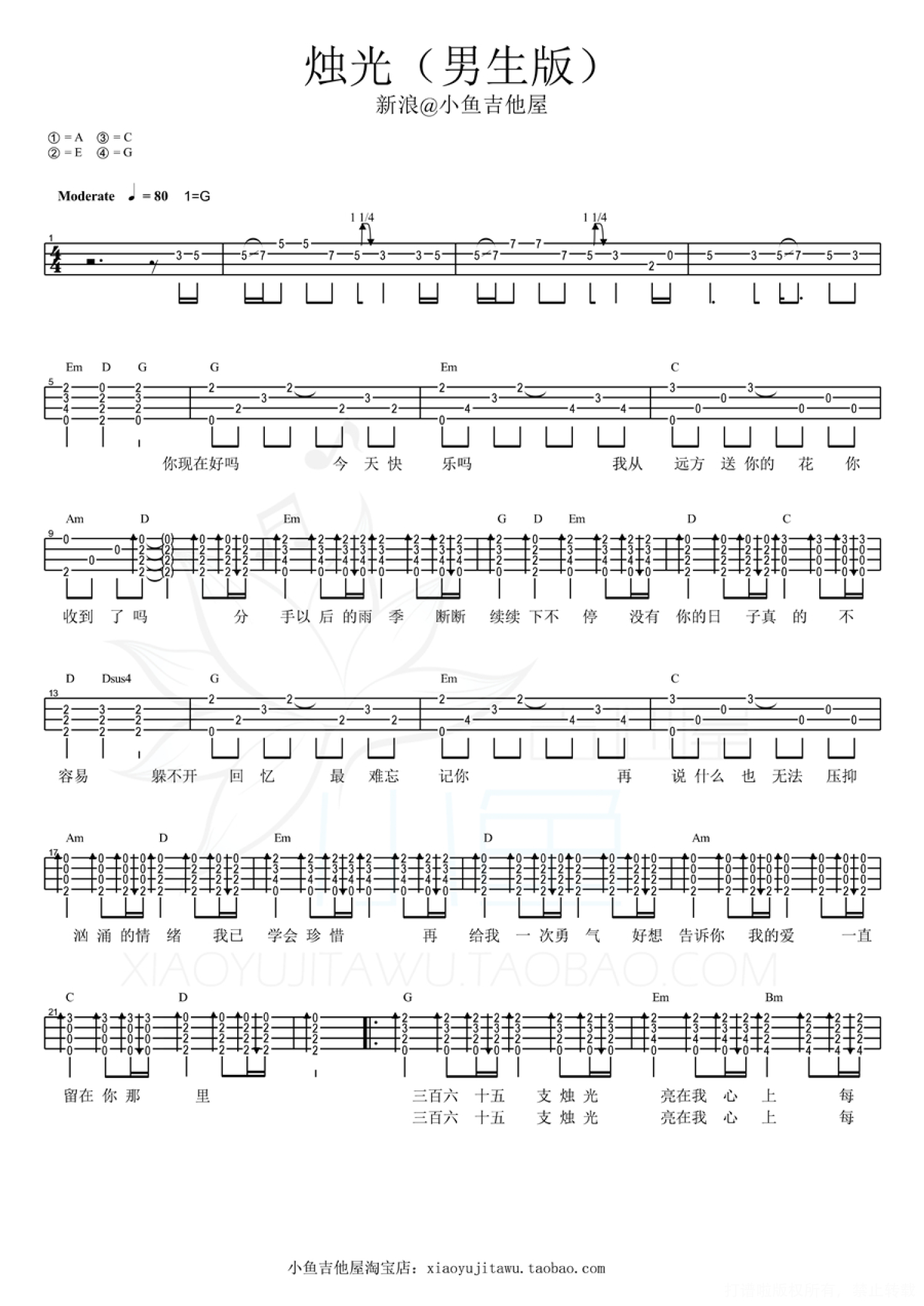 曲谱介绍: 任贤齐《烛光》_G调尤克里里谱_男生版