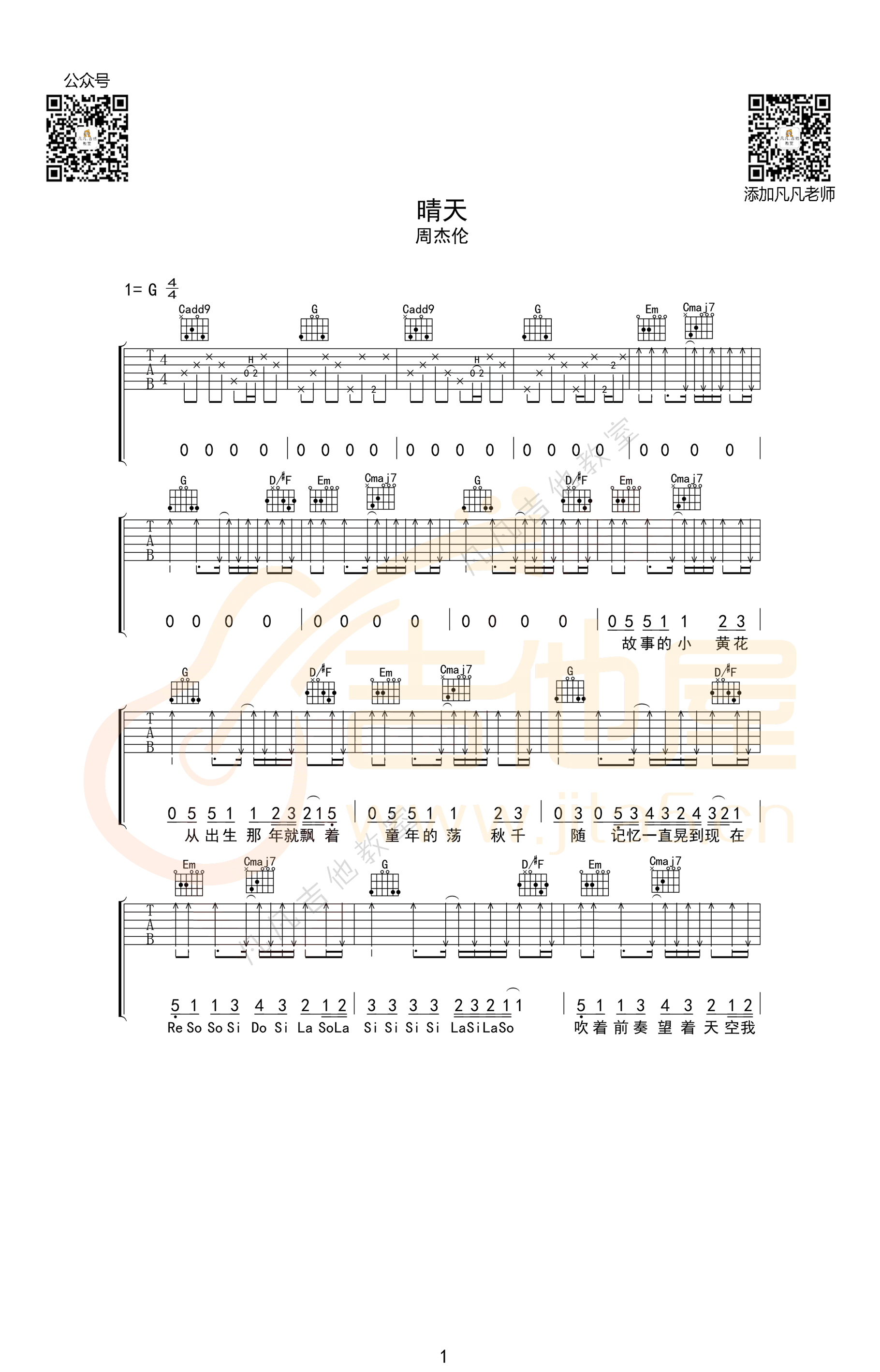 曲谱介绍: 晴天吉他谱_周杰伦_《晴天》G调原版编配_高清弹唱六线谱分享,《晴天》是由周杰伦创作并演唱的一首经典情歌,这是一首浪漫的少年情歌,有风花雪月,更多的是怅然若失,很散文诗式的情怀,用周杰伦的方式演绎,就更带点伤感。个去将回忆的思绪充分放大,校园时代的青涩,甜美纯真的爱情,桀骜不驯的叛逆,在这首歌里全都有体现。歌词中出彩的“re si duo si”的日本发音,恰到好处的衔接,听上去简直如一个美丽而忧伤的青春爱情故事,让人有掉泪的冲动。