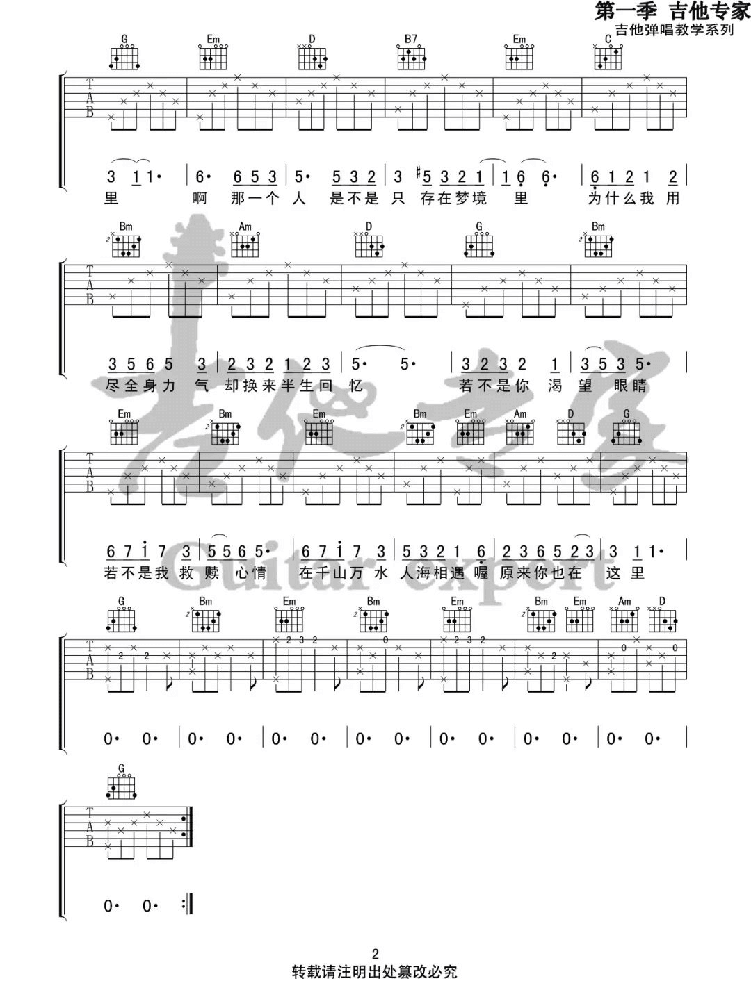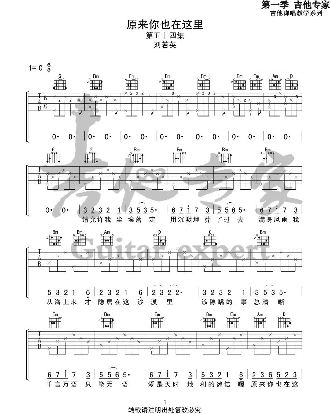 曲谱介绍: 《原来你也在这里》吉他谱_刘若英_G调原版弹唱谱_高清六线谱分享,《原来你也在这里》是刘若英演唱的一首歌曲,这首歌是由一首日本歌曲改编而来,这首歌原版的节拍为2/4拍,而这里为了记谱方便,特意改成了6/8拍的节奏。 此版本的曲谱来源于吉他专家扒谱制谱,这里歌曲采用G调指法根据原版进行编配,演唱时根据自己的嗓音情况夹变调夹。这首歌指法比较简单,但由于是由2/4拍改为6/8拍,所以在节奏方面需要注意一下。 《原来你也在这里》吉他谱_刘若英_G调原版弹唱谱_高清六线谱1: