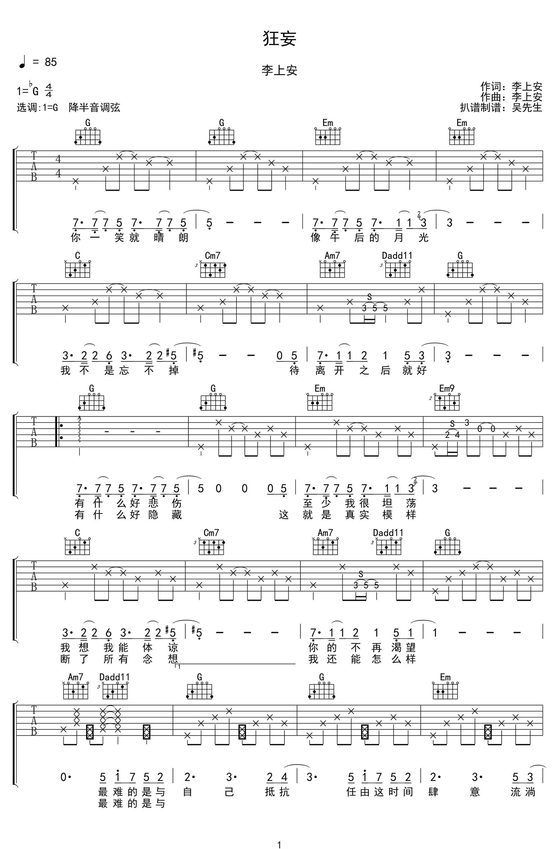 狂妄吉他谱 - 李上安 - G调吉他弹唱谱 - 原版
