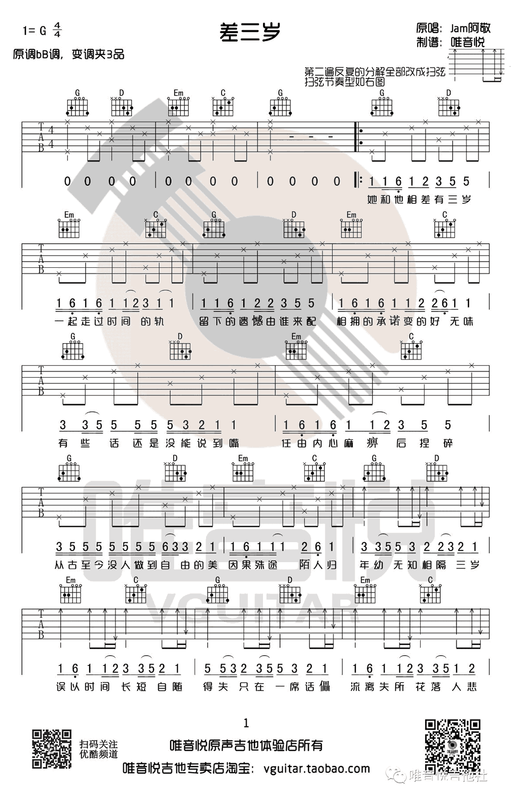 差三岁吉他谱 - Jam - G调吉他弹唱谱