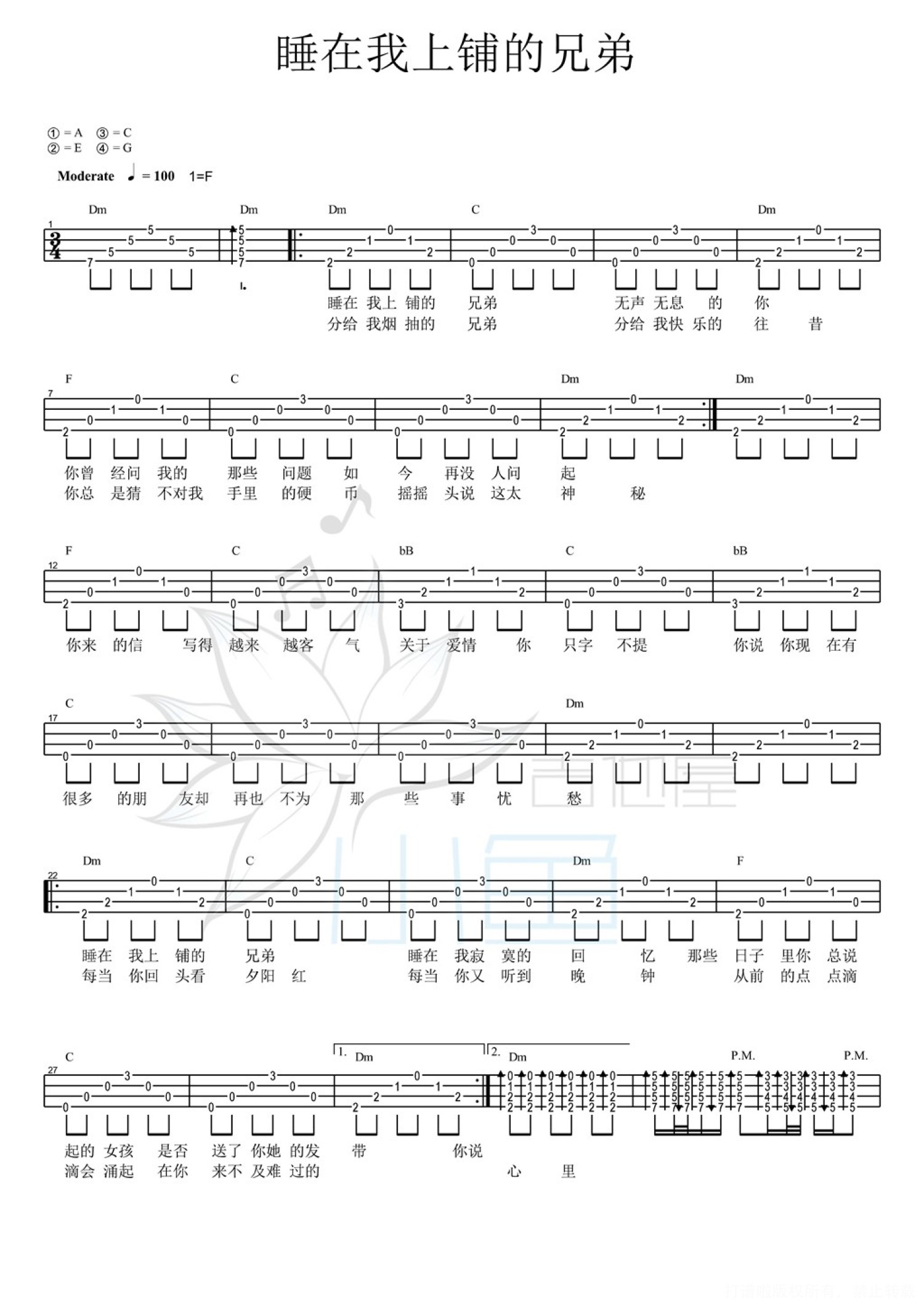 曲谱介绍: 《睡在我上铺的兄弟》是老狼演唱的一首歌曲。由高晓松作词、作曲,收录在大地唱片1994年发行的合辑《校园民谣1》中。这首歌曲是老狼的代表作品之一《睡在我上铺的兄弟》尤克里里弹唱教学