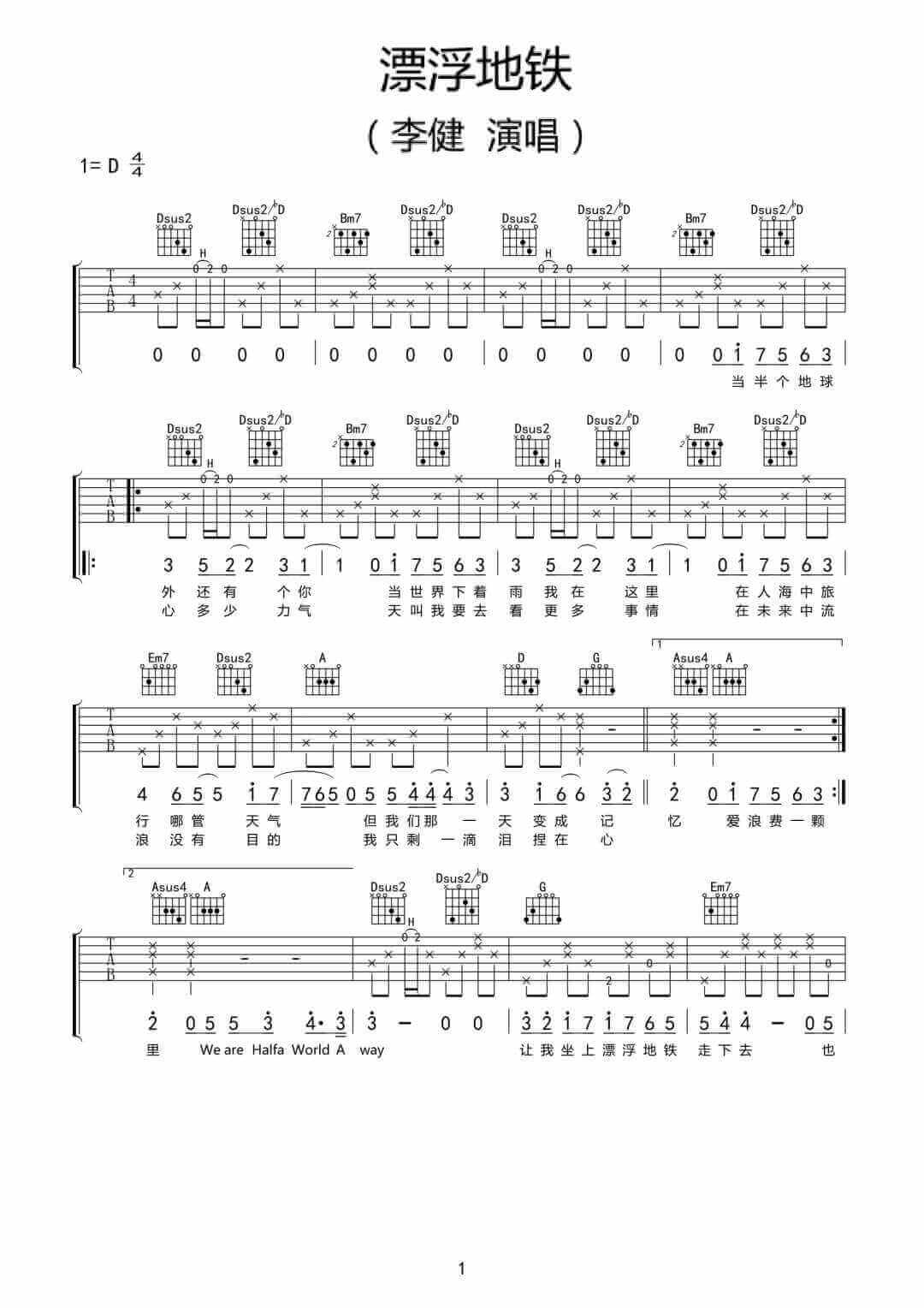 曲谱介绍: 《漂浮地铁》吉他谱_李健_D调弹唱六线谱_高清图片谱分享,《漂浮地铁》是由李宇春演唱的一首歌曲,近期李健在《中国好声音》的舞台上用自己的方式重新诠释了这首歌。李健的声音诠释“漂浮地铁”这四个字实在是太合适了,一面在下,一面在上,既有地底的流动,又有高空的漂浮,三年前他同样唱过一首关于“地铁”的歌,那是《十点半的地铁》的关怀与温情,三年后唱着另一幅地铁之景,是《漂浮地铁》的悠柔与轻盈。