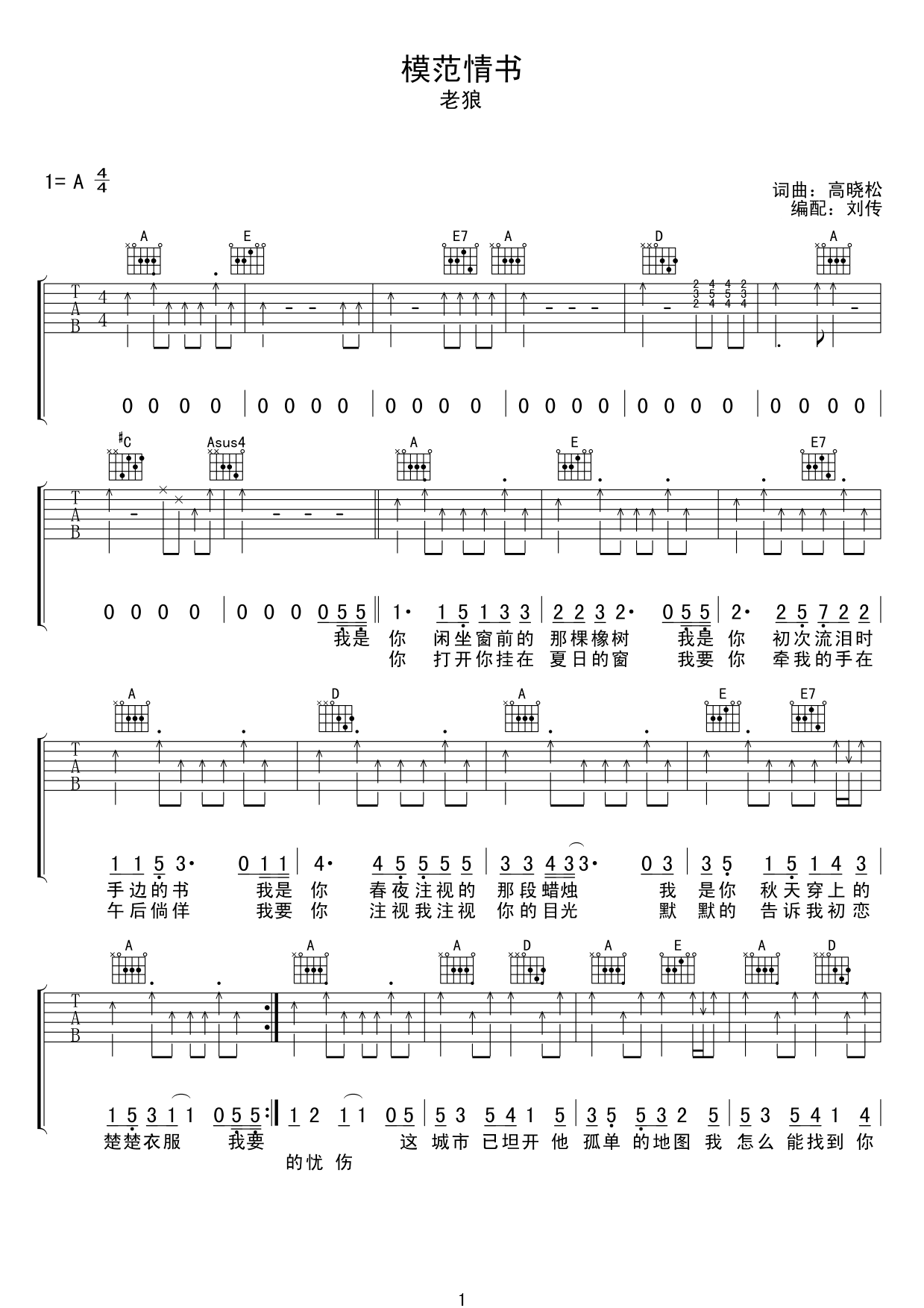 模范情书吉他谱 - 老狼 - A调吉他弹唱谱