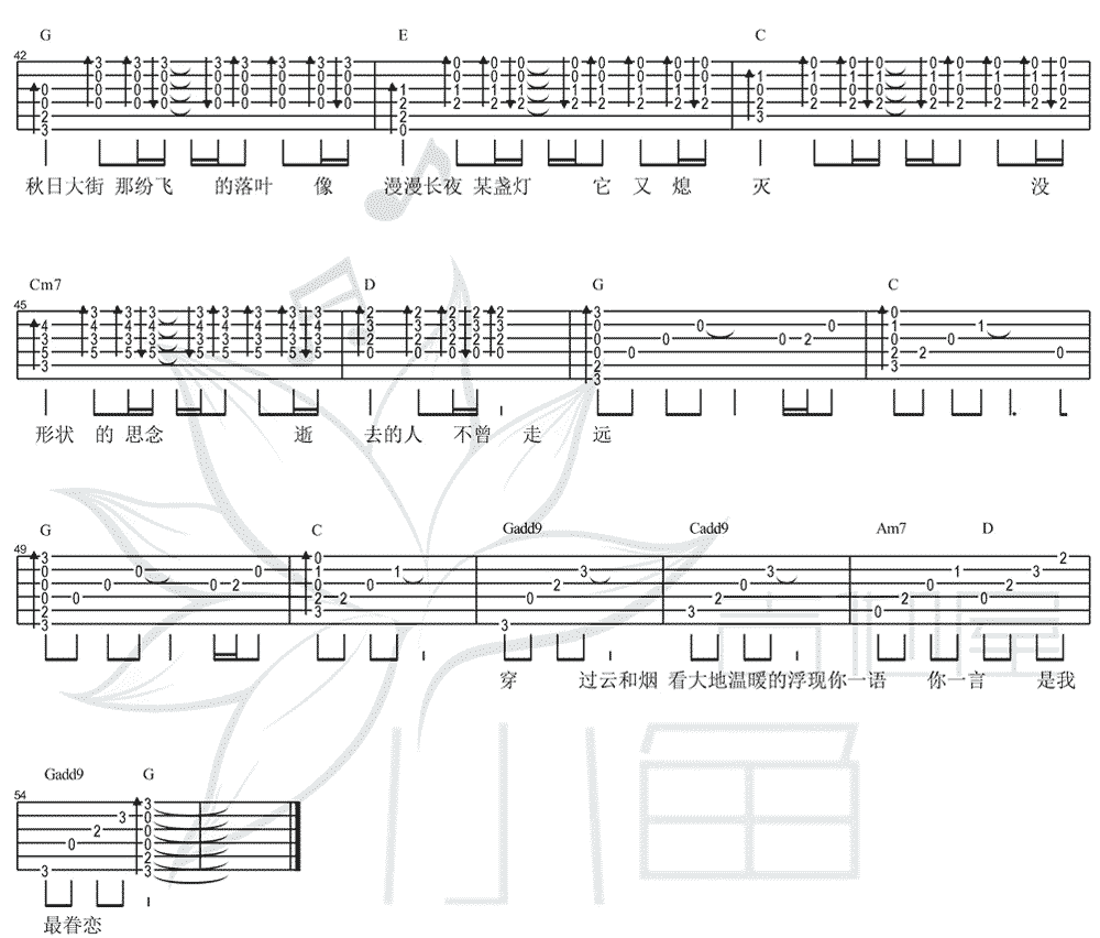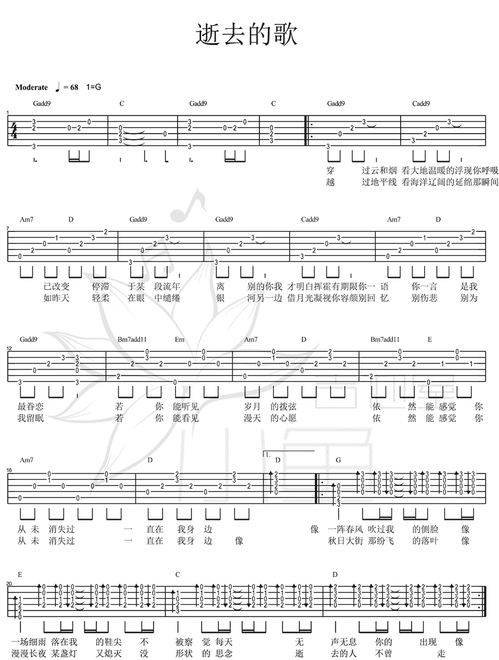 曲谱介绍: 《逝去的歌》吉他谱_旅行团乐队_G调原版弹唱谱_高清六线谱分享,《逝去的歌》是由阿肆作词,旅行团乐队演唱的一首歌,这首歌浅吟低唱中却蕴含了极大的力量,让大家在听这首歌的时候也能切身感受面对离别时的情景,或失落或缅怀或感恩,各有各不同。 此版本的曲谱来源于网络搜集,版权归原作者所有。歌曲采用G调指法根据原版进行编配。这个版本的谱子是采用GP编的谱,谱中并未把和弦图标注出来,有些生僻和弦需要自己去查一下指法,整体难度不大。 《逝去的歌》吉他谱_旅行团乐队_G调原版弹唱谱_高清六线谱1: