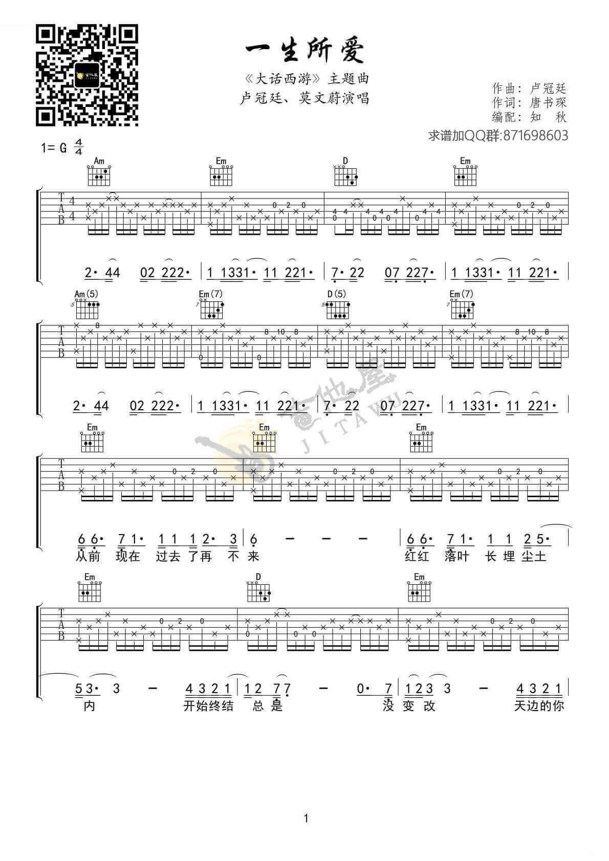 曲谱介绍: 卢冠廷《一生所爱》莫文蔚G调简单版弹唱吉他谱_高清图片谱分享,要说《大话西游》最经典的一段,那肯定要数最后周星驰跟朱茵在城门上的那一段,伴随着《一生所爱》的音乐响起,每个人都忘不了当时那一幕,还有最后的那一句“你看那个人,好像一条狗啊”,此版本为卢冠廷和莫文蔚合唱版本,采用G调指法简单编配,全曲没什么难度,很容易练下来。 卢冠廷《一生所爱》莫文蔚G调简单版弹唱吉他谱_高清图片谱1: