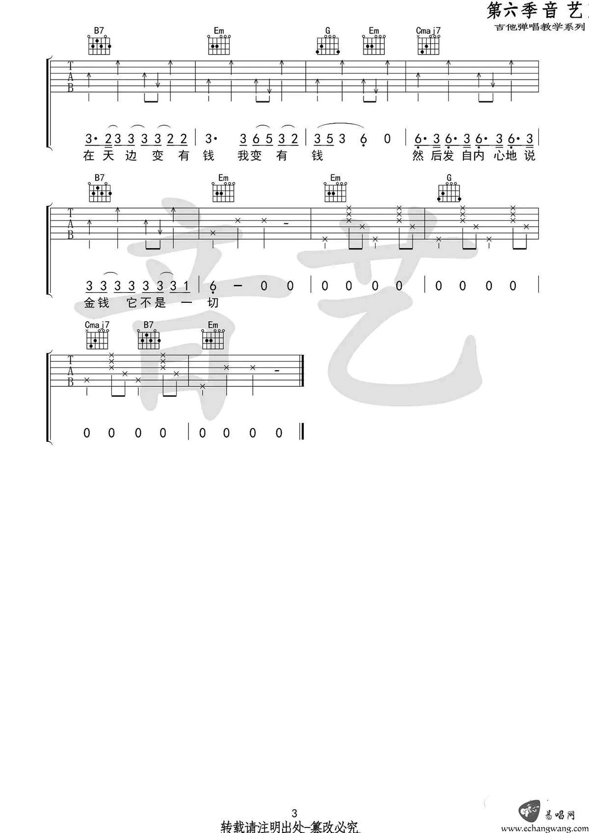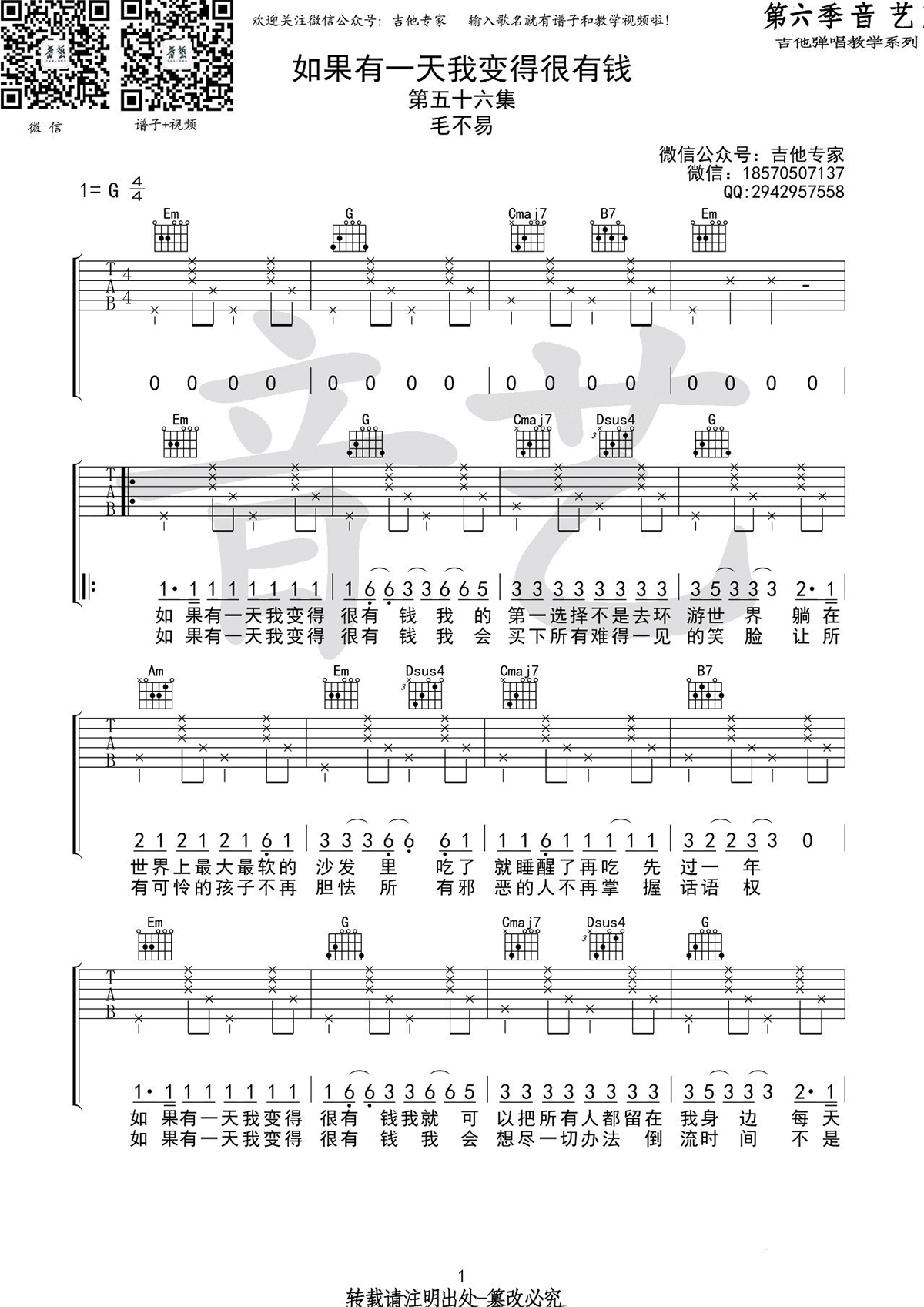 曲谱介绍: 《如果有一天我变得很有钱》吉他谱_毛不易_G调弹唱六线谱分享,《如果有一天我变得很有钱》是由赵兆编曲,毛不易作词、作曲并演唱的歌曲,钱,有人热烈追求、有人视为身外之物;有人觉得谈钱是一件俗气的事情,但我觉得用音乐来表达对金钱的需求是一个很优雅的方式。毛不易的这首歌用轻快的节奏唱出了对金钱的欲望,对金钱创造的美好生活的向往,把生活世俗唱的清新脱俗。