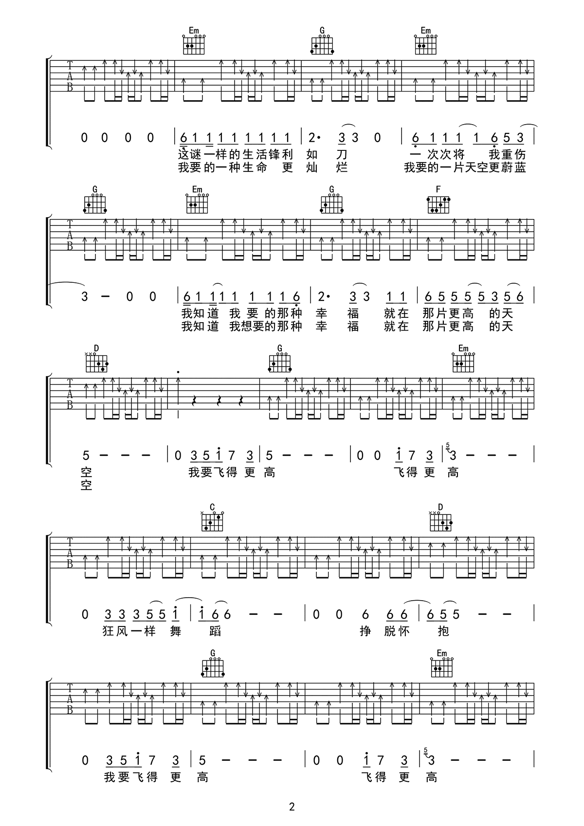 飞得更高吉他谱 - 汪峰 - G调吉他弹唱谱