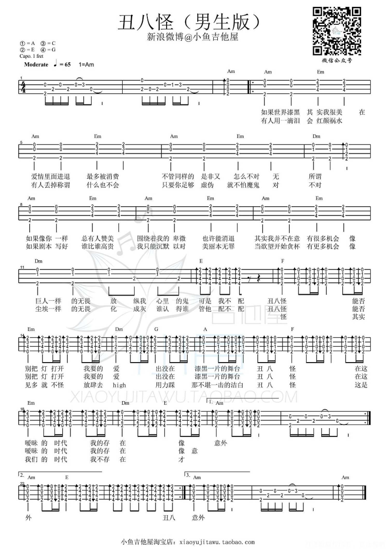 曲谱介绍: 丑八怪,ukulele小鱼弹唱视频