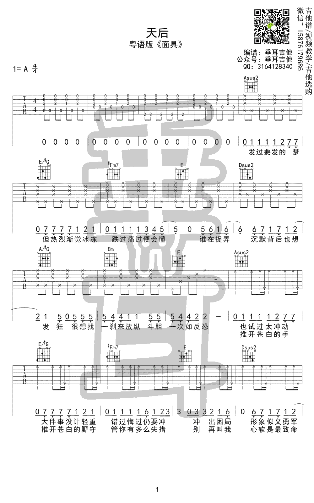 曲谱介绍: 《面具》吉他谱_许廷铿_天后粤语版_A调高清弹唱六线谱分享,《面具》是许廷铿演唱的一首粤语歌曲,这首歌也是陈势安演唱《天后》的粤语版。这首歌很多人说是不甘于备胎的诠释,但是似乎我觉得不是这样的,但是确实有不甘的情感。少年的青葱,被世间所束缚着,现在的社会真的很多人带着面具生活吧。与《天后》不同的是,在唱《面具》时许廷铿在演绎上更具张力,更别致地展现出那份延伸在歌词中关于成长的反叛与压抑。