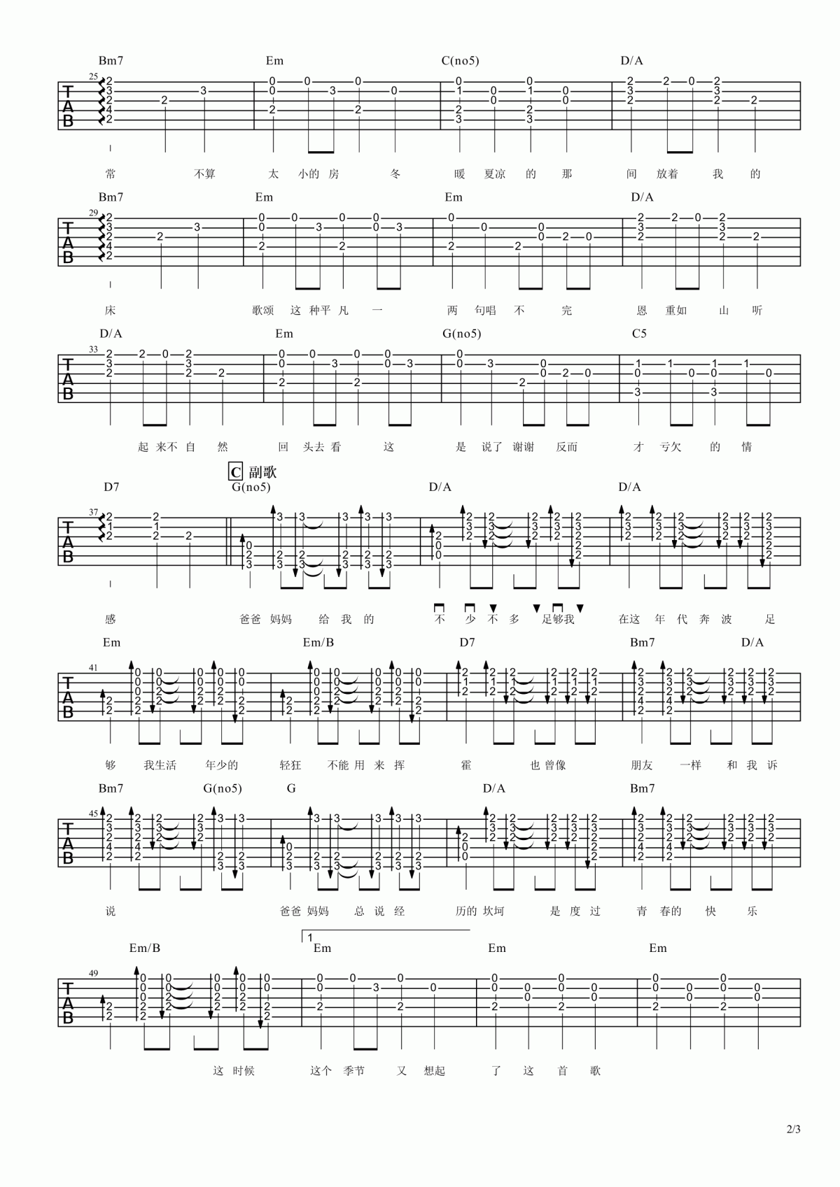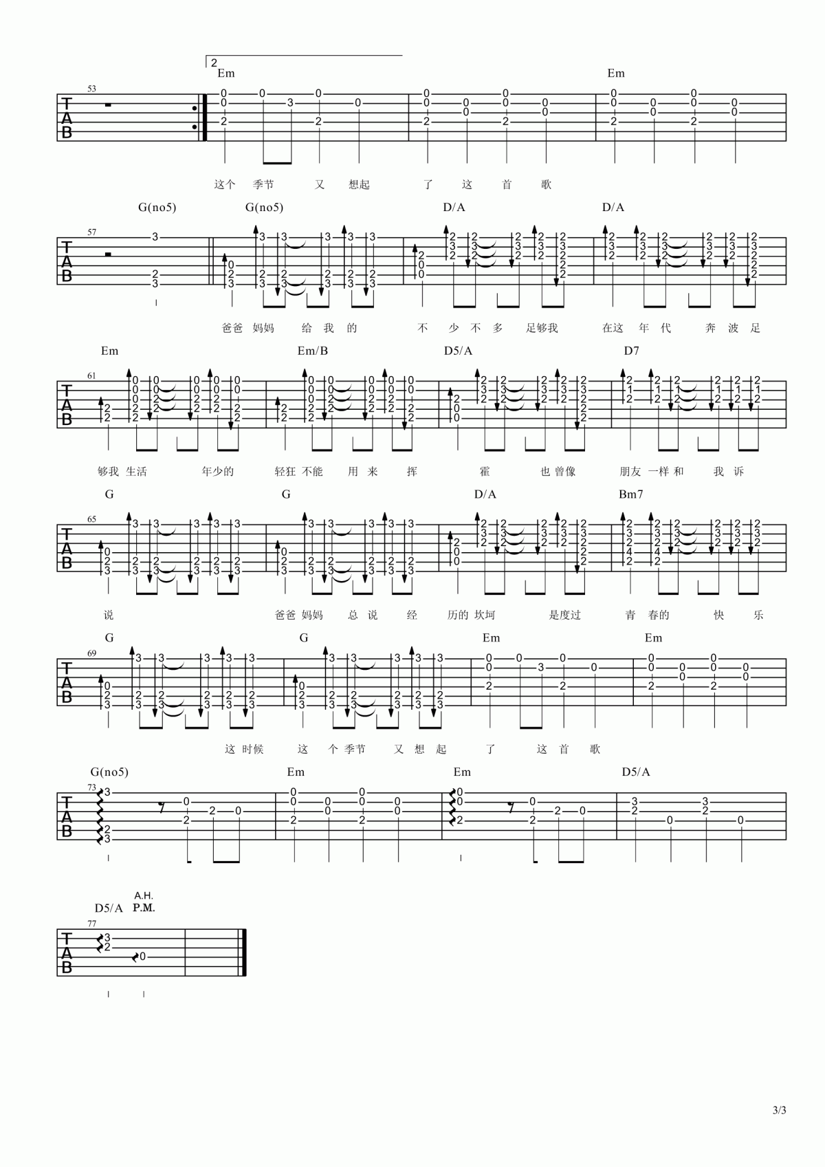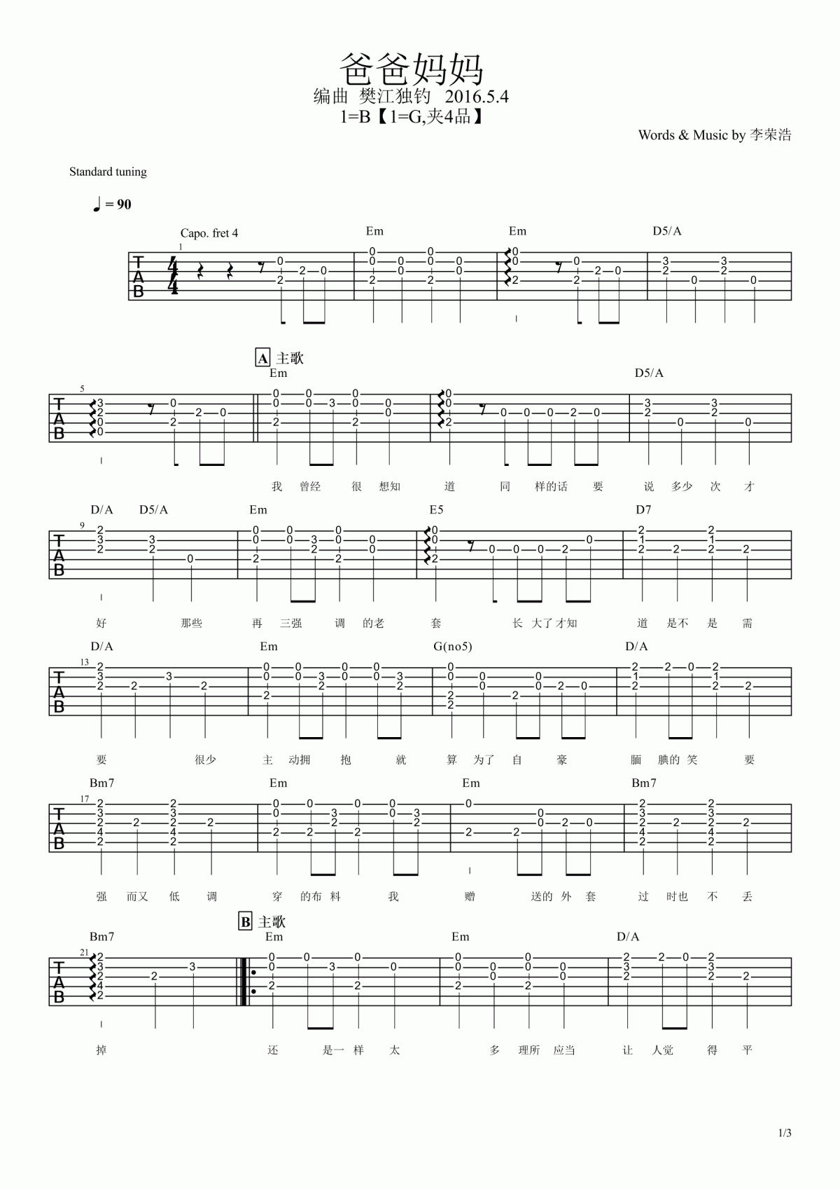 曲谱介绍: 李荣浩《爸爸妈妈》吉他弹唱谱,采用G调指法编配,共有3张高清图谱。