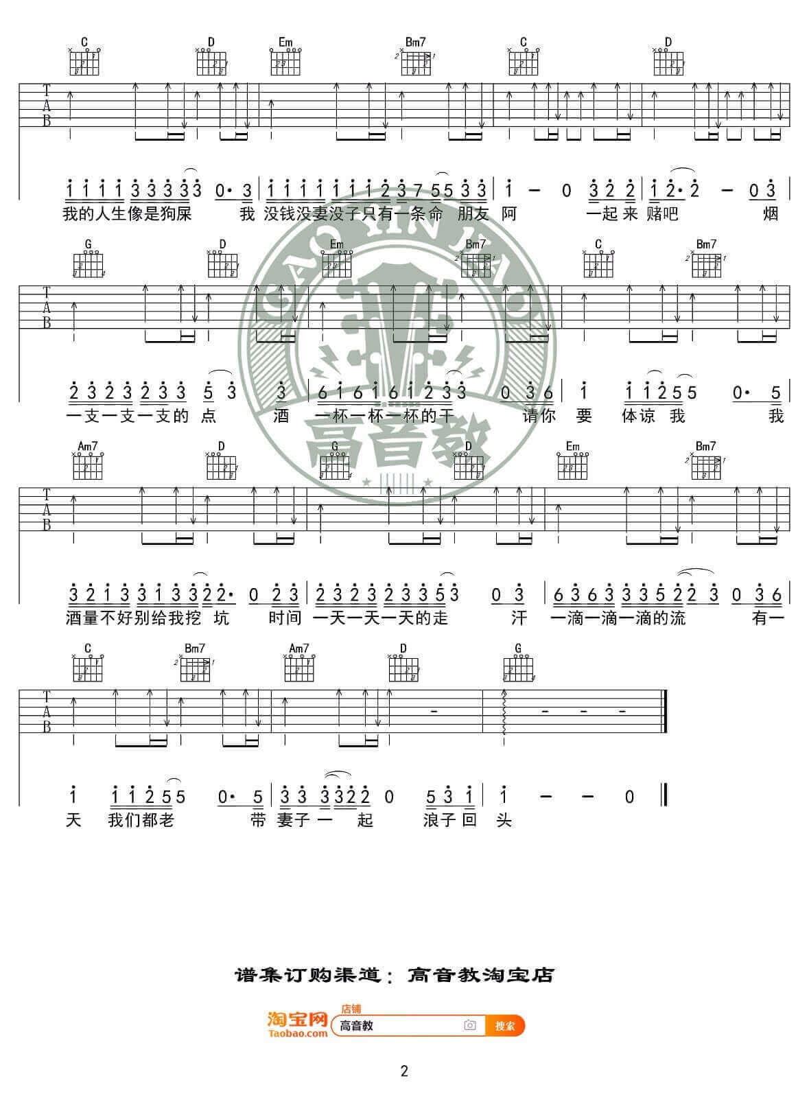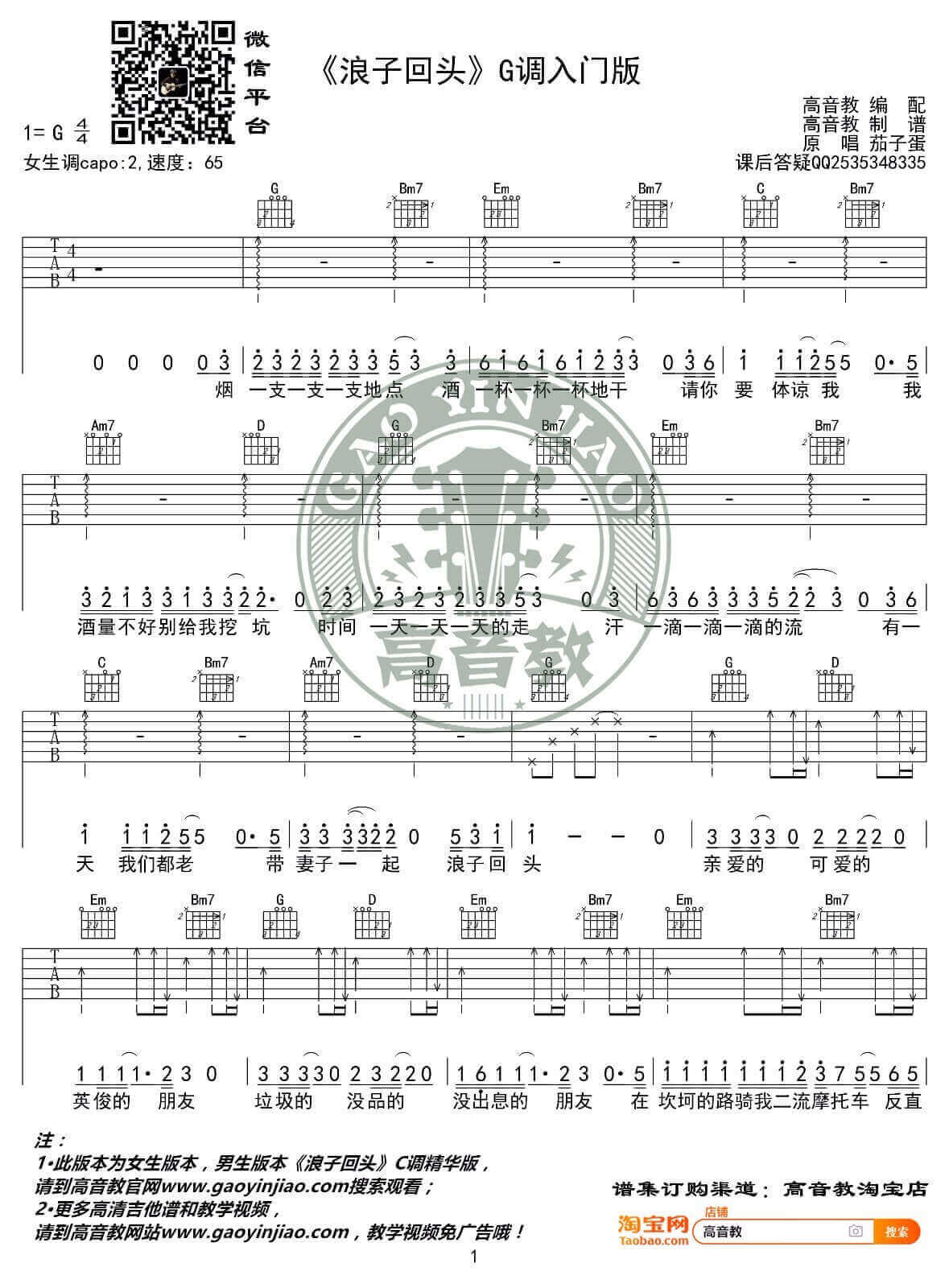 曲谱介绍: 《浪子回头》吉他谱_茄子蛋弹唱吉他谱_G调简单版六线谱分享,来自台湾组合茄子蛋的一首非常好听的闽南语歌曲《浪子回头》,前段时间在抖音上非常火,此版本为高音教团队编配的曲谱,采用G调指法简单编配,适合用来练手,对于喜欢这首歌的新手朋友们,此版本是个不错的选择。 《浪子回头》吉他谱_茄子蛋弹唱吉他谱_G调简单版六线谱1: