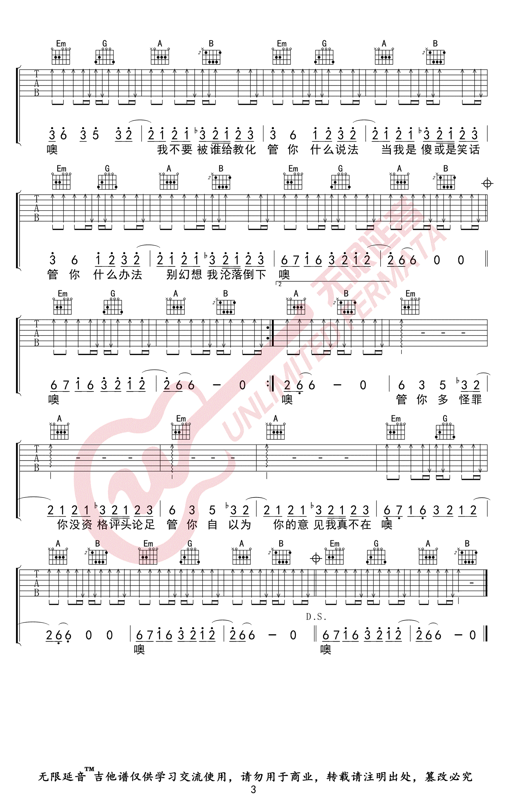 曲谱介绍: 《我管你》吉他谱_华晨宇_G调简单版弹唱六线谱_高清图片谱分享,《我管你》是由华晨宇作曲并演唱的一首歌,华晨宇的演唱在第二段变得更加强而有力,摇滚歌手式的嘶吼呐喊与贝斯一起,沿着情感波动的主线将爆点不停引燃,展示出一股游走于年轻与成熟之间的力量。花花咬字发音,嗓音切换,每个细节都处理得精致,声音可塑性太强。