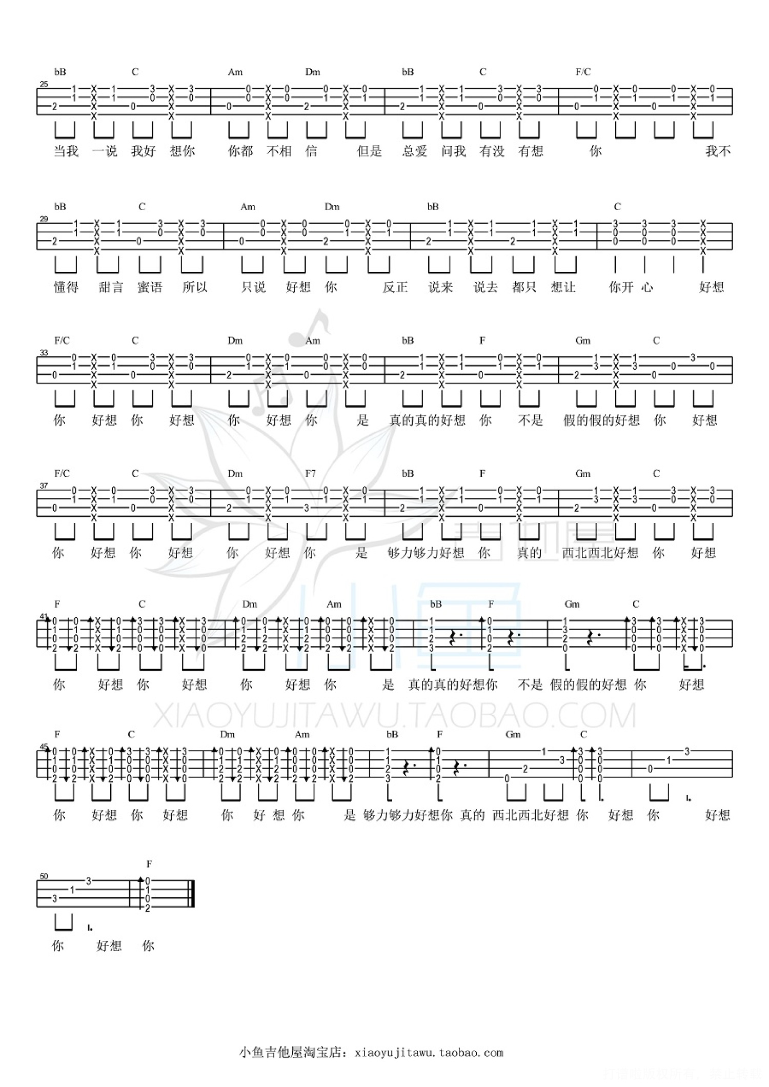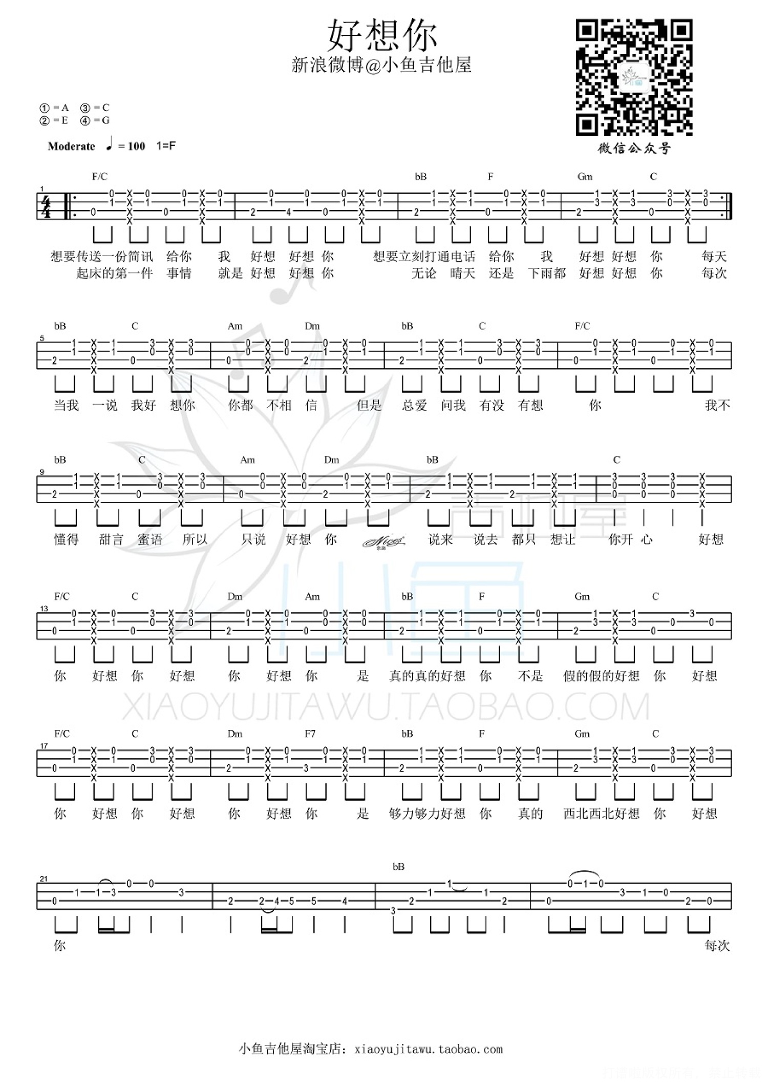 曲谱介绍: 四叶草《好想你》_C调尤克里里谱
