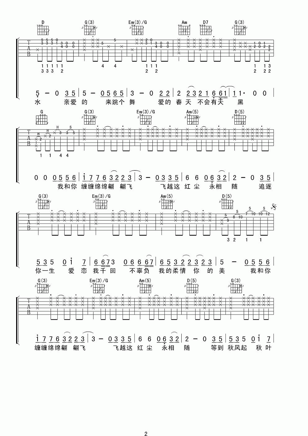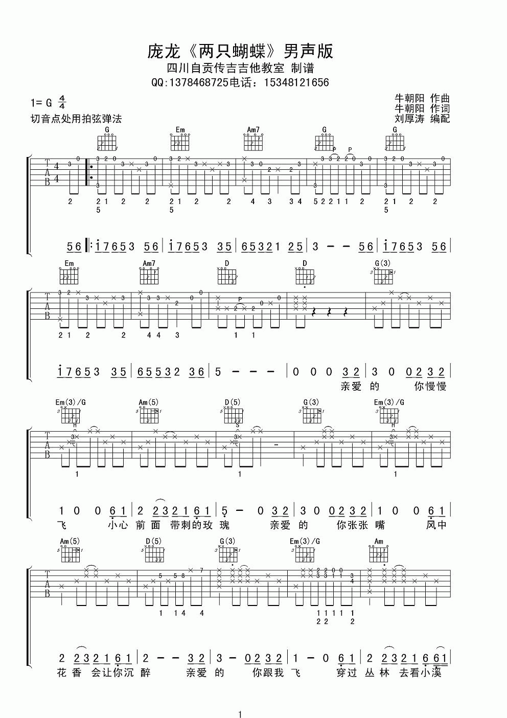 曲谱介绍: 庞龙《两只蝴蝶》吉他弹唱谱,采用G调指法编配,共有3张高清图谱。