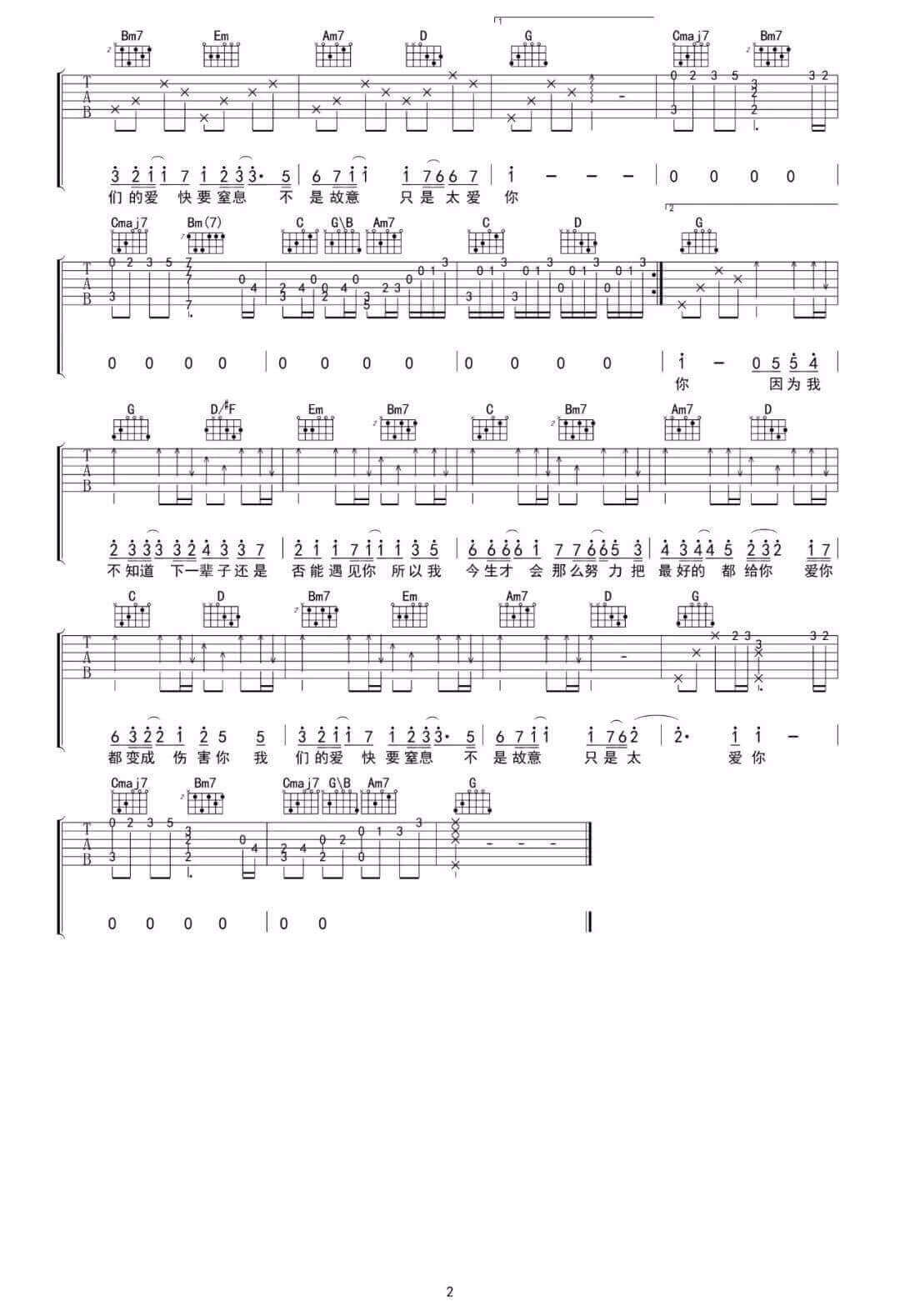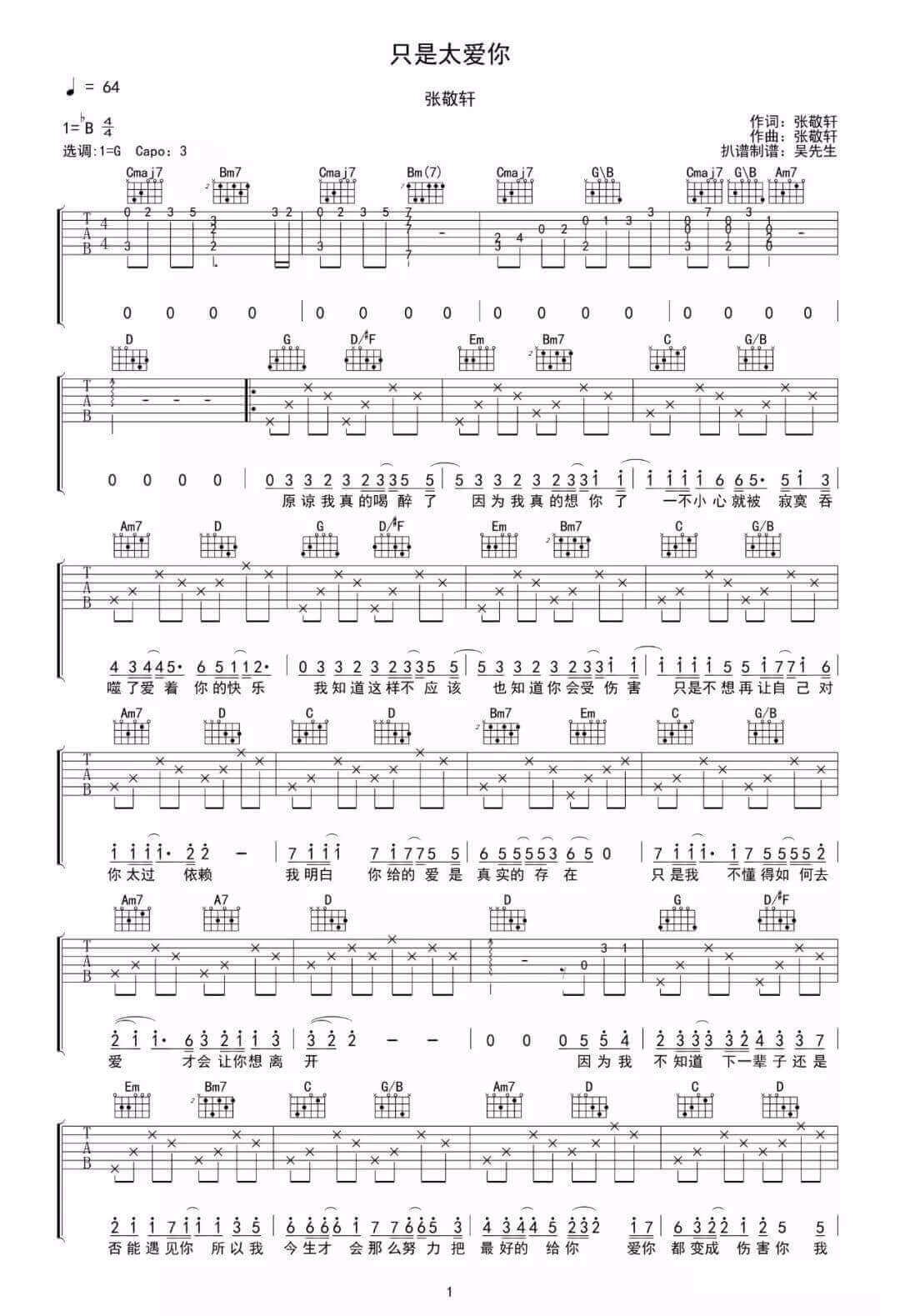 曲谱介绍: 《只是太爱你》吉他谱_张敬轩_G调原版弹唱六线谱_高清图片谱分享,《只是太爱你》这首歌是由张敬轩作词作曲并演唱的一首歌曲。原谅我真的喝醉了,因为我真的想你了,一不小心就被寂寞,吞噬了爱着你的快乐。 此版本的曲谱来源于吴先生,歌曲原调为降B调,这里采用G调指法根据原版编配,演唱时夹变调夹3品,前奏中存在较多旋律音,这部分需要好好练习。 《只是太爱你》吉他谱_张敬轩_G调原版弹唱六线谱_高清图片谱1: