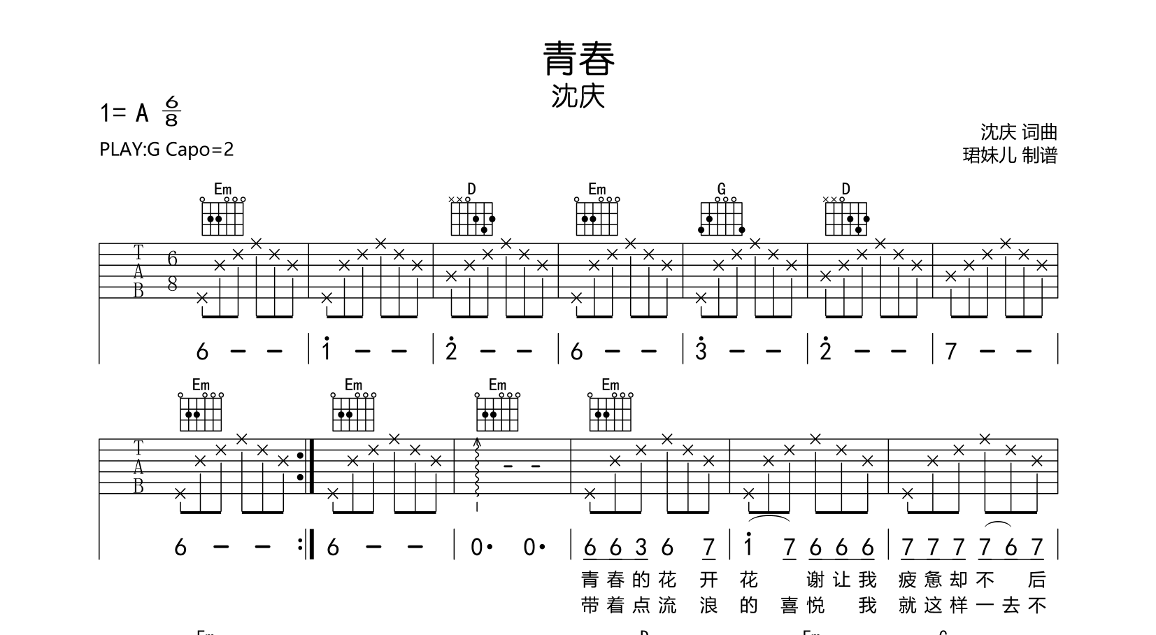 曲谱介绍: 青春吉他谱_沈庆_G调六线谱_民谣佳作分享,本谱采用C调指法编配,弹唱建议变调夹4品,速度75BPM,难度较简单,易上手,由珺妹儿制谱上传。