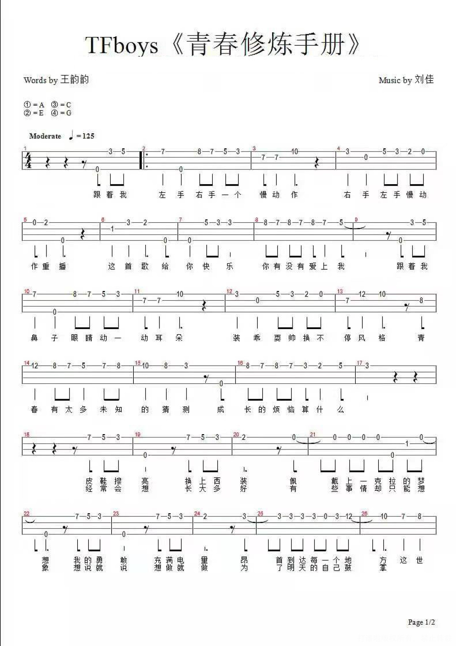 曲谱介绍: TFBOYS《青春修炼手册》_C调尤克里里谱