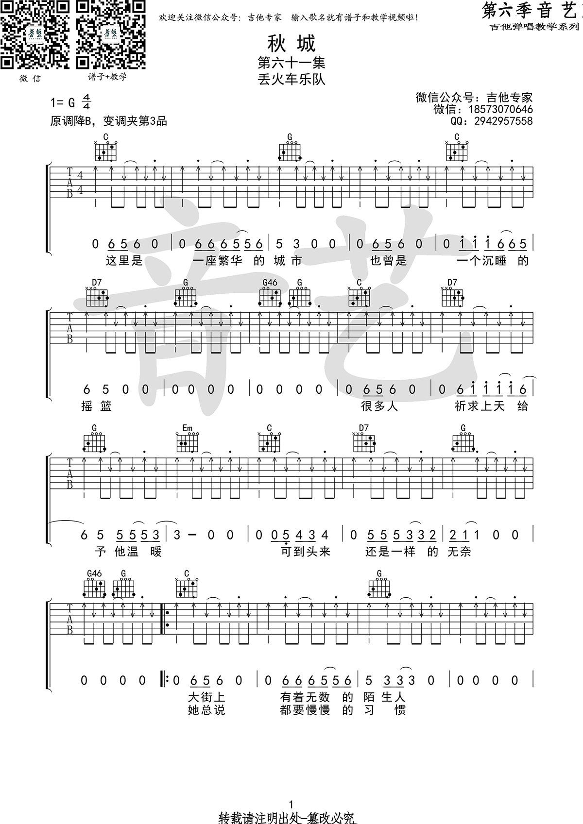 秋城吉他谱 - 丢火车乐队 - G调吉他弹唱谱