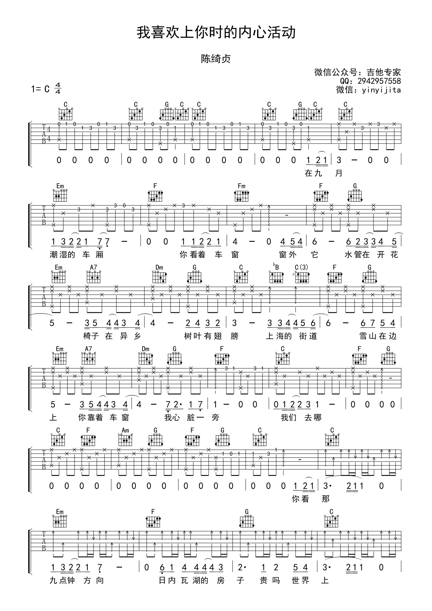 • 我喜欢上你时的内心活动吉他谱 - 陈绮贞 - C调吉他弹唱谱第1张