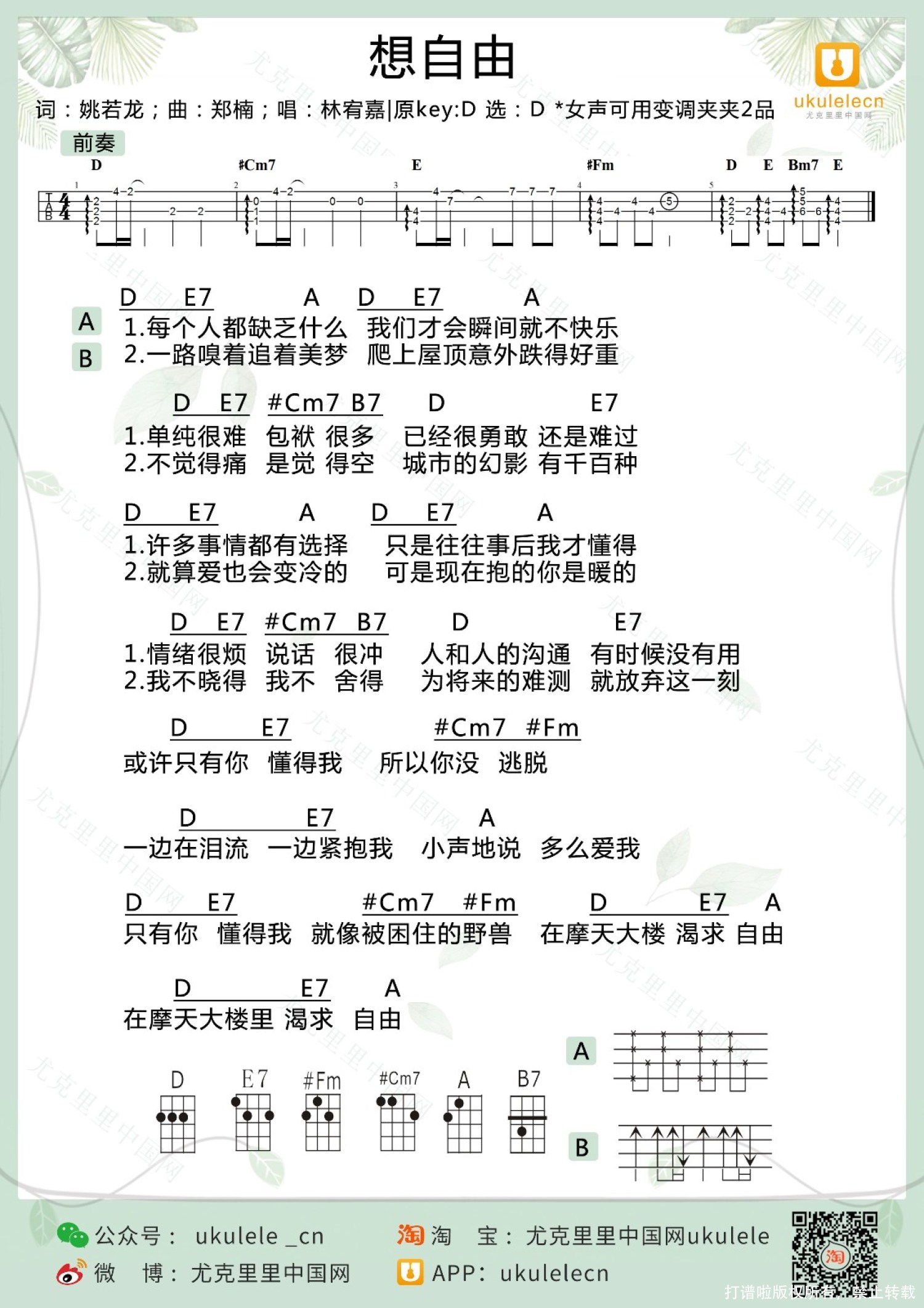 曲谱介绍: 林宥嘉《想自由》_D调尤克里里谱