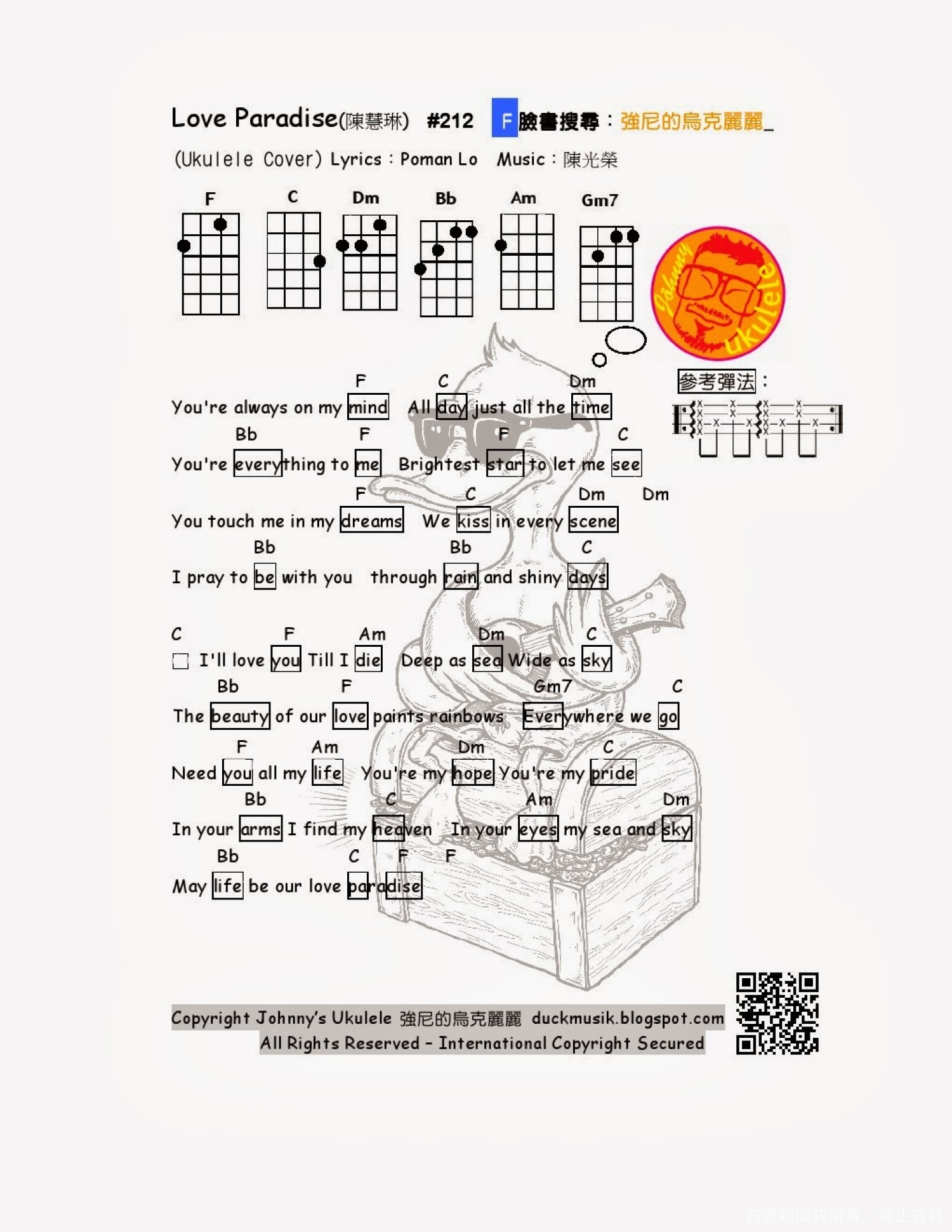 曲谱介绍: 陈慧琳最经典的歌之一,阳光积极简单又温暖,给恋人的歌。LoveParadiseukulele谱:右手很简单的:下-切上-上切上uke界很火的泰国小妹妹GailSophicha的演绎: