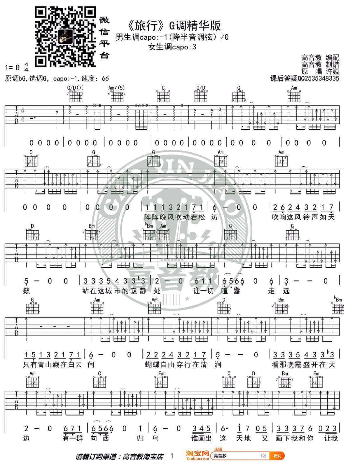 曲谱介绍: 《旅行》吉他谱_许巍_G调原版弹唱六线谱_高清图片谱分享,据说许巍的这首《旅行》是为了纪念2004年因车祸逝世的朋友而制作,想起这位逝去的老朋友生前最喜欢的事情就是去旅行,经过半年多的斟酌,最终为这首歌定名,可以说这也是许巍的自白书。本次的曲谱由高音教团队出品,采用G调指法原版编配,降半音调弦。 《旅行》吉他谱_许巍_G调原版弹唱六线谱_高清图片谱1: