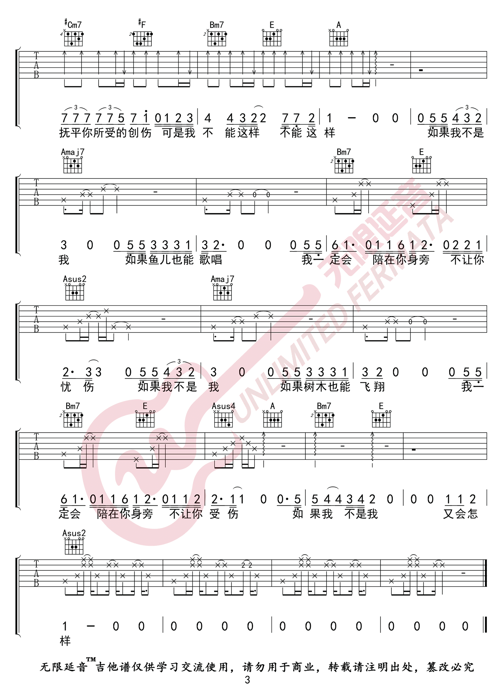 曲谱介绍: 《如果我不是我》吉他谱_李宇春_A调原版弹唱谱_高清六线谱分享,《如果我不是我》是电影《半个喜剧》的主题曲,由李宇春演唱。用回归民谣的曲风和温暖歌词,为敢爱之人量身定制了一首治愈系的爱情寄语,鼓励期待爱情的人勇敢去爱。 此版本的曲谱来源于无限延音扒谱制谱,歌曲原调为B调,这里采用了A调指法根据原版进行编配,演唱时夹变调夹2品回到原调。曲谱编配有一定难度,主要在于前奏部分的切分节奏和后面一些较为复杂的和弦,需要多加练习。 《如果我不是我》吉他谱_李宇春_A调原版弹唱谱_高清六线谱1:
