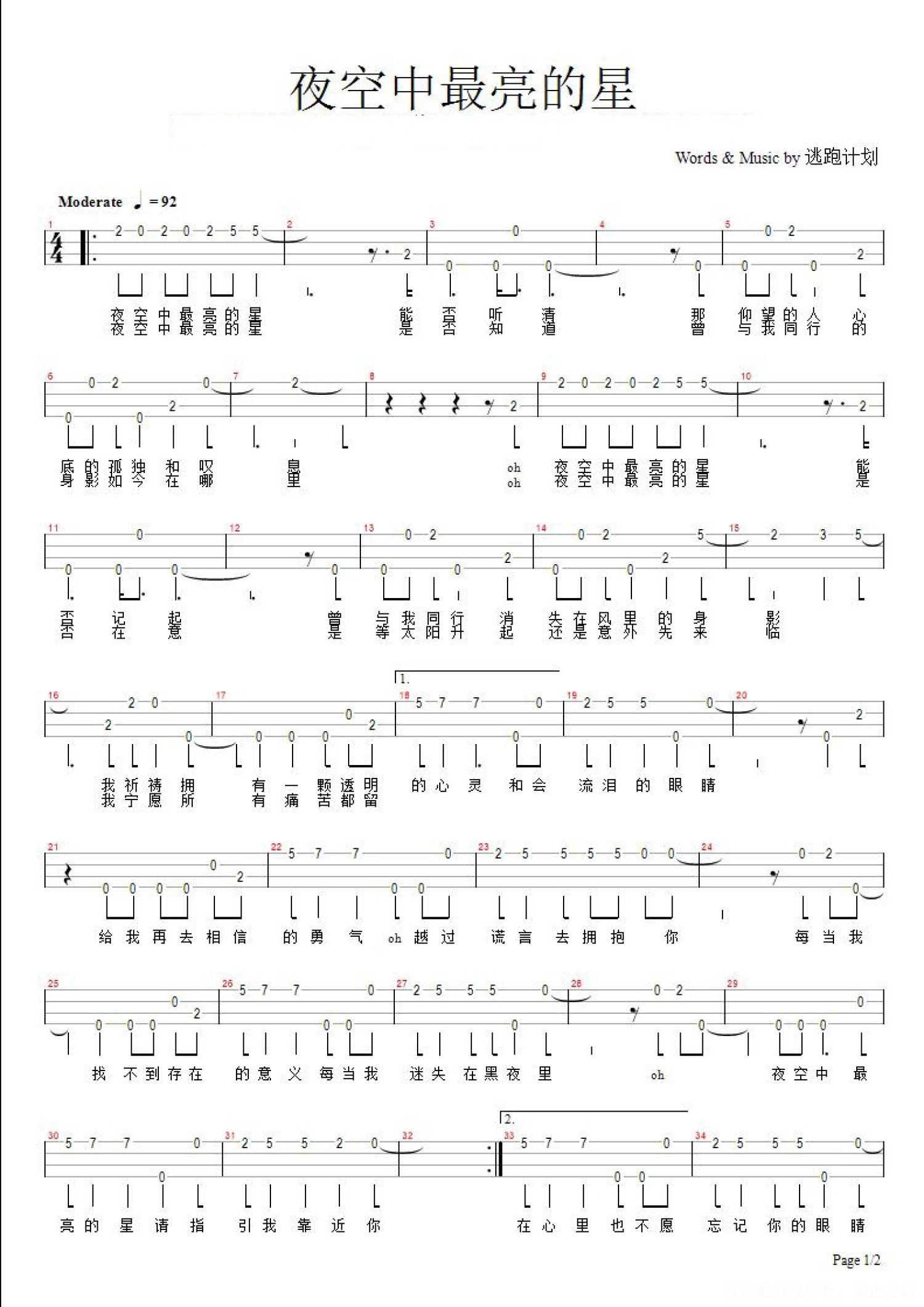 曲谱介绍: 逃跑计划乐队的经典歌曲,第四届中国摇滚迷笛奖最佳年度摇滚歌曲奖。夜空中最亮的星尤克里里谱:非常详细的谱子了,下面还有教学,其他就不说了。
