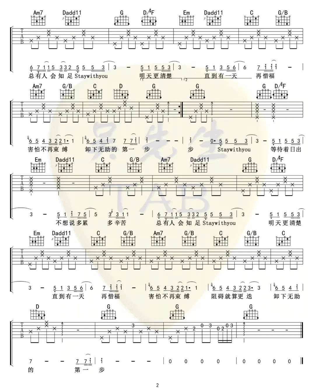 曲谱介绍: 《Stay With You》吉他谱_林俊杰/孙燕姿_G调原版弹唱谱_高清六线谱分享,《Stay With You》是由林俊杰为武汉这次新型冠状病毒疫情所作并演唱的一首歌,歌词由孙燕姿所作。人们在面对自己未知的事物时,会害怕会无助,而林俊杰用自己的歌声,用音乐让所到之处的人们充满力量和勇气,一点点抚平人们内心里的丝丝惶恐。 此版本的曲谱来源于吴先生扒谱制谱,这里歌曲采用G调指法根据原版进行编配,演唱时可根据自己的嗓音情况夹变调夹,这首歌编配难度不大,使用的和弦及节奏型和弦都十分简单,比较容易练习。 《Stay With You》吉他谱_林俊杰/孙燕姿_G调原版弹唱谱_高清六线谱1: