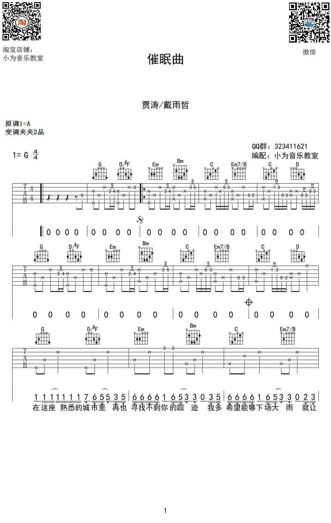 催眠曲吉他谱 - 贾涛戴/雨哲 - G调吉他弹唱谱 - 原版