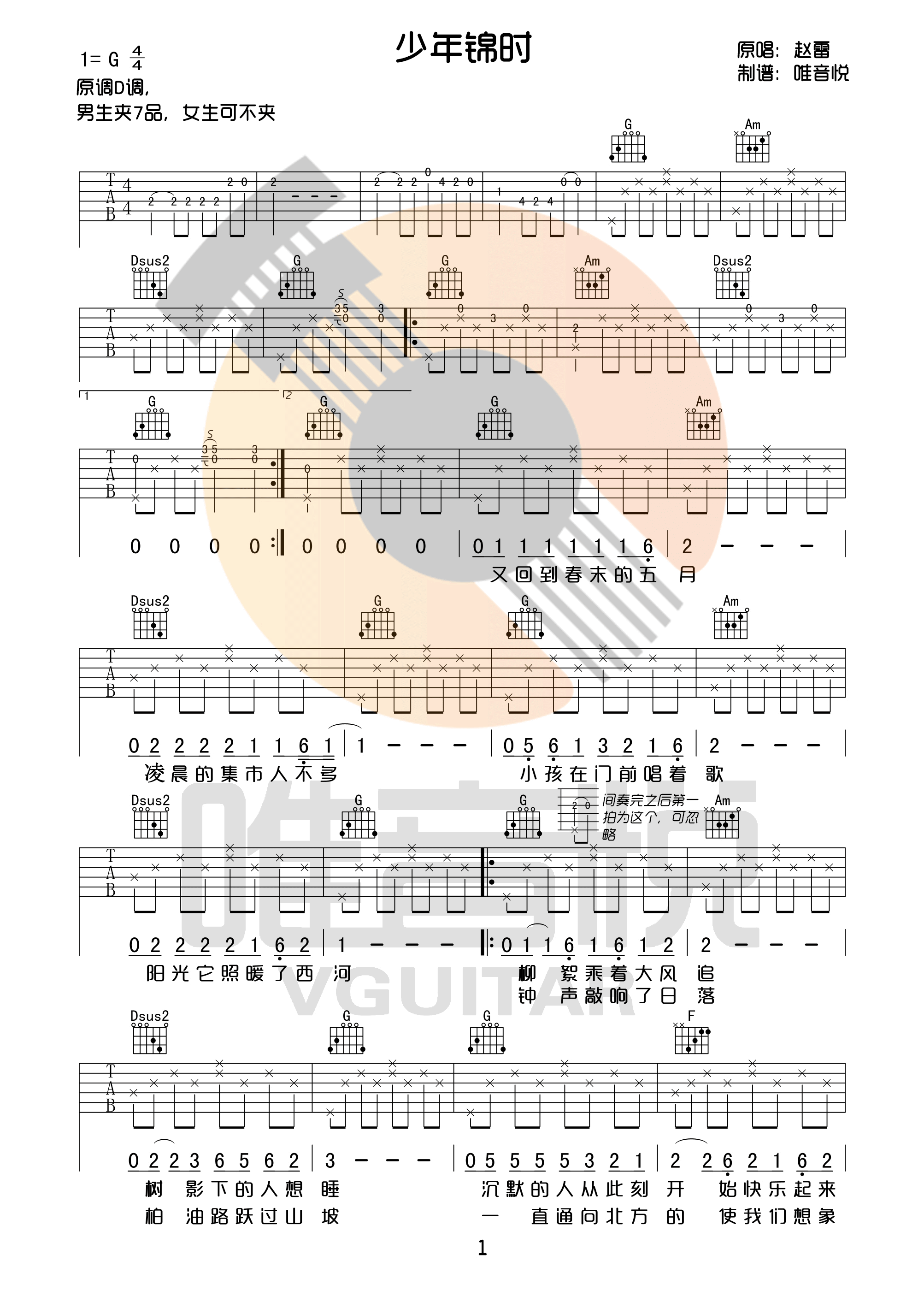 曲谱介绍: 赵雷《少年锦时》G调超简单版吉他弹唱谱_女生版分享,此版本的曲谱为唯音悦编配制谱并分享,感谢唯音悦团队。这首歌原调为D调,选调采用G调指法编配,适合女生的调式,整体难度不大,女生演唱可不夹变调夹,男生建议夹7品。 值得注意的是,后面谱子中存在一些休止符,弹到这些地方的时候需要制音,这样歌曲的律动性会更强,当然,如果不能熟练掌握制音技巧,不制音也是可以的。 赵雷《少年锦时》G调超简单版吉他弹唱谱_女生版1: