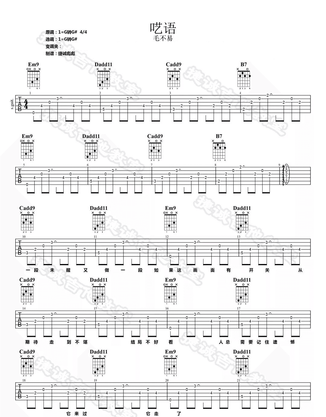曲谱介绍: 呓语吉他谱_毛不易_《呓语》G调原版弹唱六线谱_高清图片谱分享,《呓语》是由毛不易作词作曲并演唱的一首歌,毛不易在《我是唱作人》的舞台上演唱了这首歌,这首歌毛不易创作于他实习的时候,那段迷茫而压抑的日子确实给他带来许多灵感。 此版本的曲谱来源于捷诚吉他教室扒谱制谱,这里歌曲采用歌曲的原调G调根据原版进行编配,演唱时根据自己的嗓音情况夹变调夹。这首歌节奏不难,难点在于后面升半音之后的#G调和弦。 呓语吉他谱_毛不易_《呓语》G调原版弹唱六线谱_高清图片谱1-2: