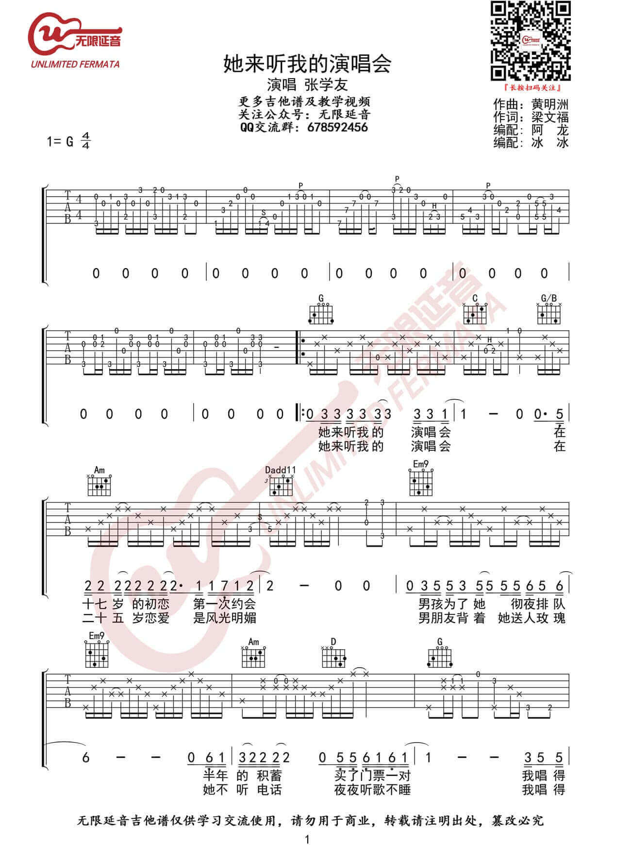 曲谱介绍: 《她来听我的演唱会》吉他谱_张学友_G调原版弹唱谱_高清图片谱分享,《她来听我的演唱会》是歌神张学友早期演唱的一首经典老情歌,歌中的故事很动人,旋律也很优美,让人欲罢不能,经常单曲循环。 此版本的曲谱来源于无限延音扒谱制谱,这里采用G调指法根据原版进行编配。这个版本的谱子有一定难度,由于每段的指法都是不一样的,所以想完整练下来,需要花一定的时间来完成。 《她来听我的演唱会》吉他谱_张学友_G调原版弹唱谱_高清图片谱1-2: