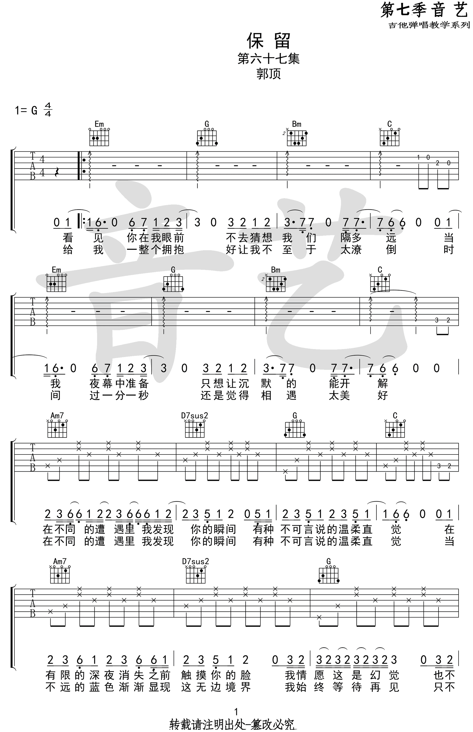 曲谱介绍: 保留吉他谱_郭顶_《保留》G调原版弹唱六线谱_高清图片谱分享,《保留》这首歌由郭顶创作并演唱,这首歌听后会感到歌声里某些深沉的哀伤,是一首听了揪心卻非常吸引人,再听一下听了会鼻酸的歌。 此版本的曲谱来源于音艺吉他扒谱制谱,歌曲采用G调指法根据原版进行编配,演唱时根据自己的嗓音情况夹变调夹。这首歌唯一的难点在于间奏及尾奏,其中的切分节奏有点不好把握,需要好好体会。 保留吉他谱_郭顶_《保留》G调原版弹唱六线谱_高清图片谱1: