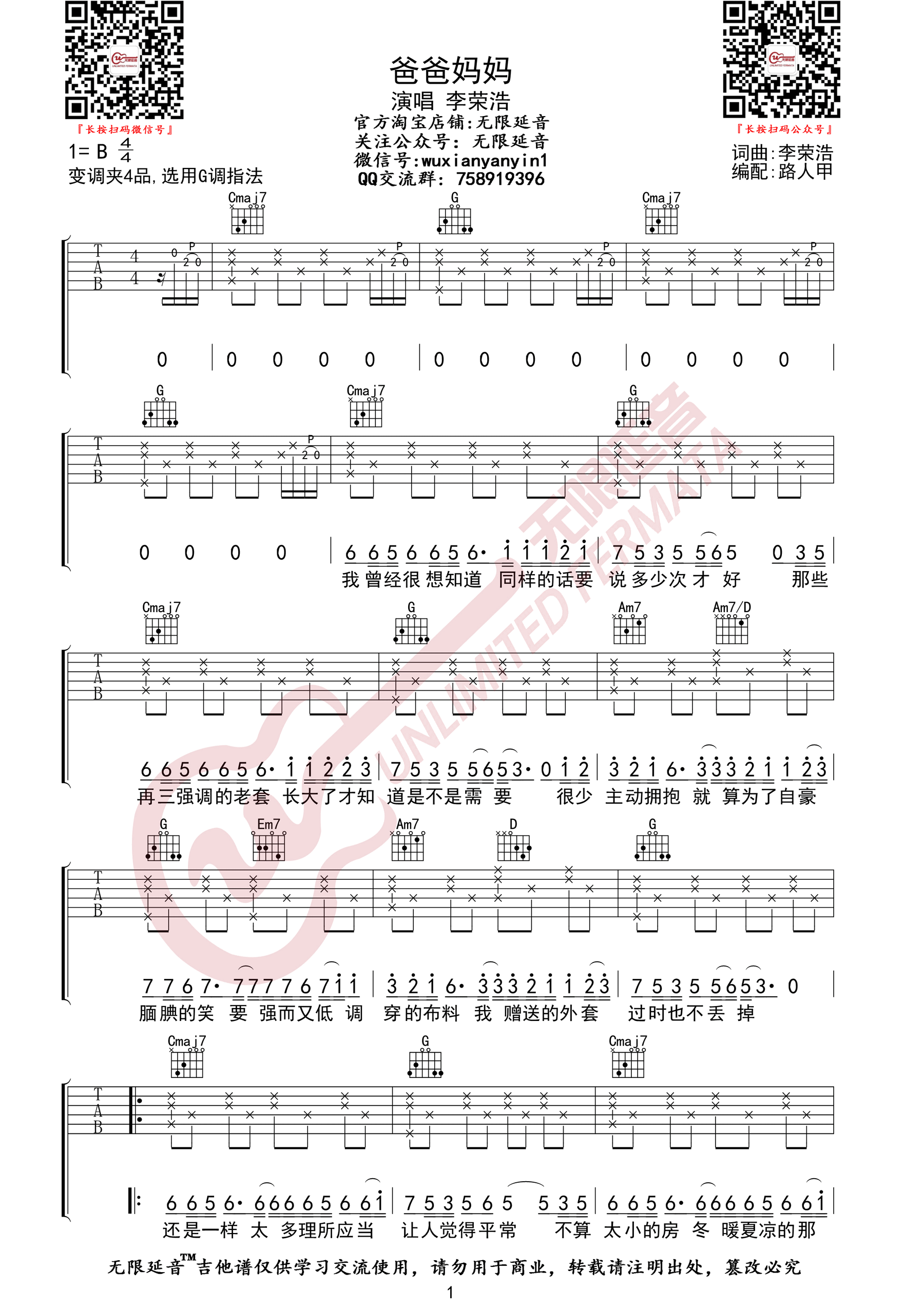 曲谱介绍: 《爸爸妈妈》吉他谱_李荣浩_G调简单版弹唱谱_高清六线谱分享,最近由李荣浩创作并演唱的这首《爸爸妈妈》又在网络上大火,在这首歌里,歌手用不煽情的词句,写出最实在的亲情。这种平淡又深刻,简单又伟大的感情在歌曲中娓娓道来,流入心底。