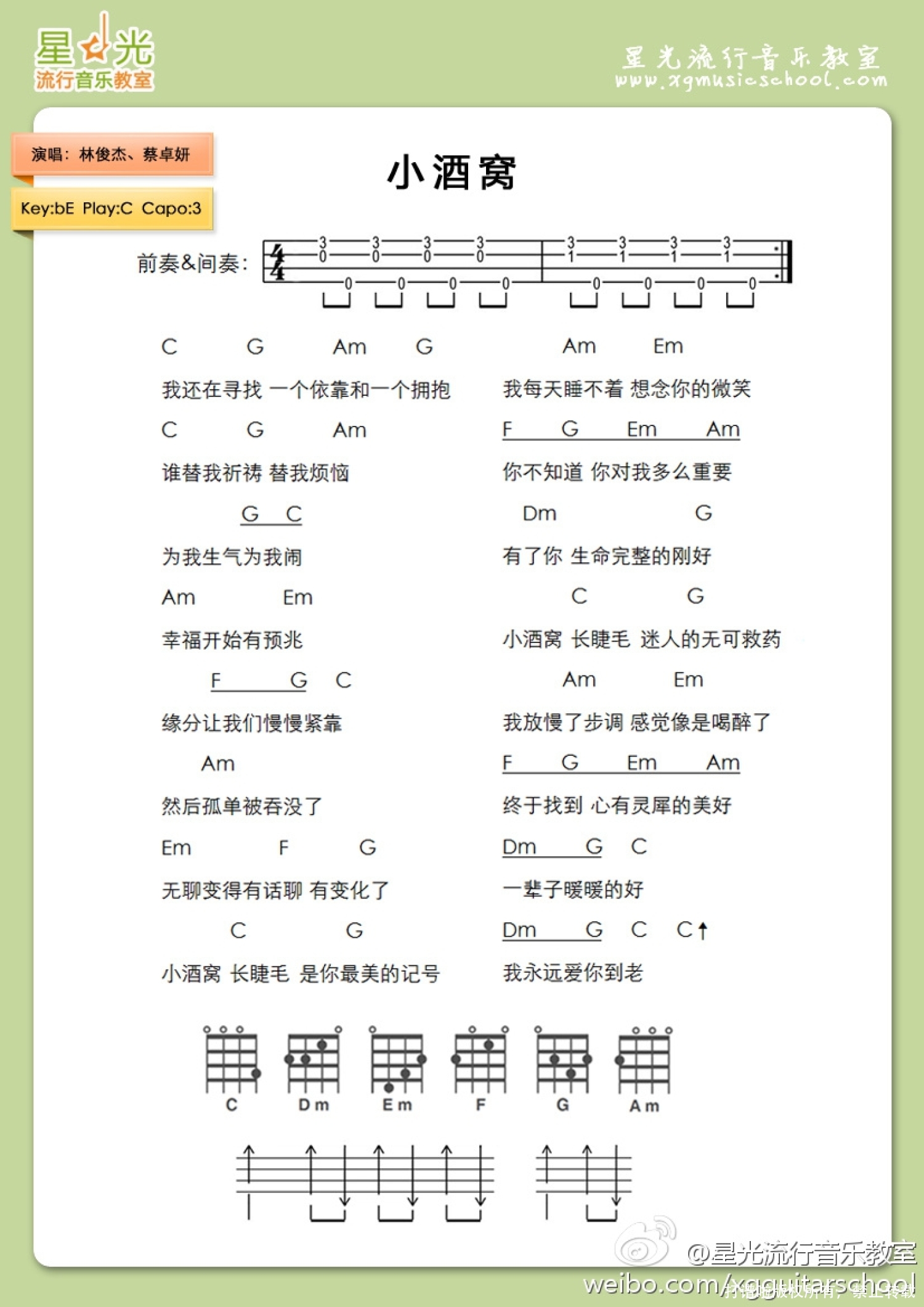 曲谱介绍: 林俊杰蔡卓妍小酒窝尤克里里谱 星光的谱一直是很详细的,只可惜数量很少。前奏间奏,右手上面都有了。简化成C调,和弦简单,别说你不会,呵呵~底部加横线的和弦时值是无横线的一半。分解和弦可以试试:(14)3231323