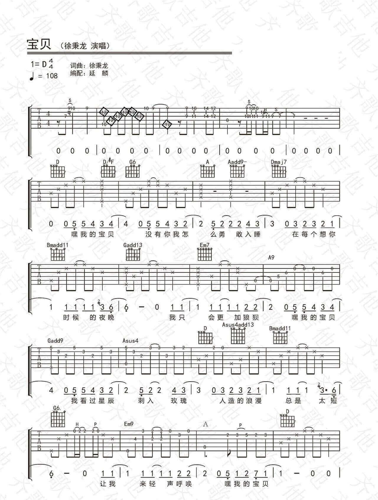 曲谱介绍: 宝贝吉他谱_徐秉龙_《宝贝》D调原版弹唱六线谱_高清图片谱分享,《宝贝》是由徐秉龙作词作曲并演唱的一首歌曲,这首歌十分温柔,与徐秉龙暖心男孩的角色十分相搭,歌曲整体给人的感觉可谓是暖人心脾,在寒冷的冬天里,给粉丝们带来一丝暖意。徐秉龙声音极具温柔和浪漫,开口就可以让人陷入进去,不容拒绝,不想抽身!整首歌曲既包含有小情调的那种真挚情感,还有对爱情的美好展望,以及描述了爱情应该有的模样,“原来我们才是互相拯救,在这颗不完美的星球”。