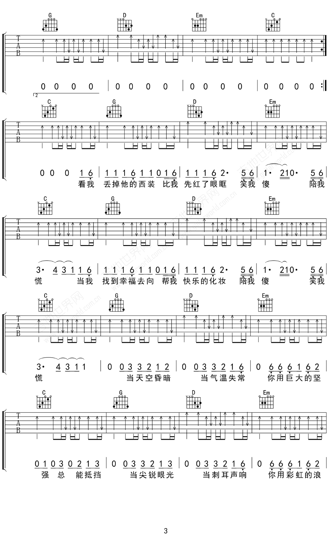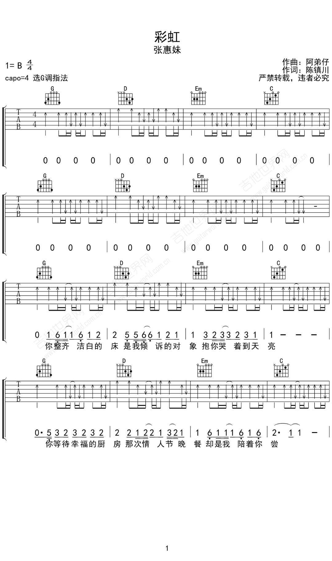 曲谱介绍: 彩虹吉他谱_张惠妹_《彩虹》G调原版弹唱六线谱_高清图片谱分享,《彩虹》是由张惠妹演唱的一首歌曲,这是一首唱给身边同志朋友的歌。歌词婉转而有力,副歌很有气势。这首歌并没有从同志的特殊以及他们的情爱方面入手,而是从同志作为朋友的一面切入。其中,“衣柜不算太宽”中的衣柜,代表同志的世界,因为同志表明自己的身份常被叫做“出柜”。张惠妹认为,无论是哪一种爱都不该受到歧视,都是值得尊重的。