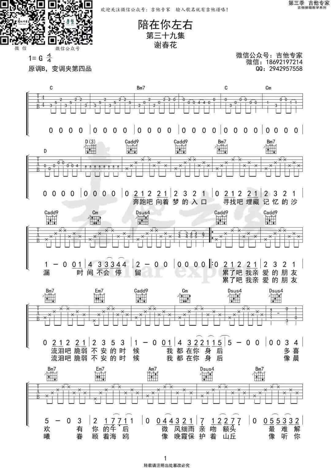 陪在你左右吉他谱 - 谢春花 - G调吉他弹唱谱