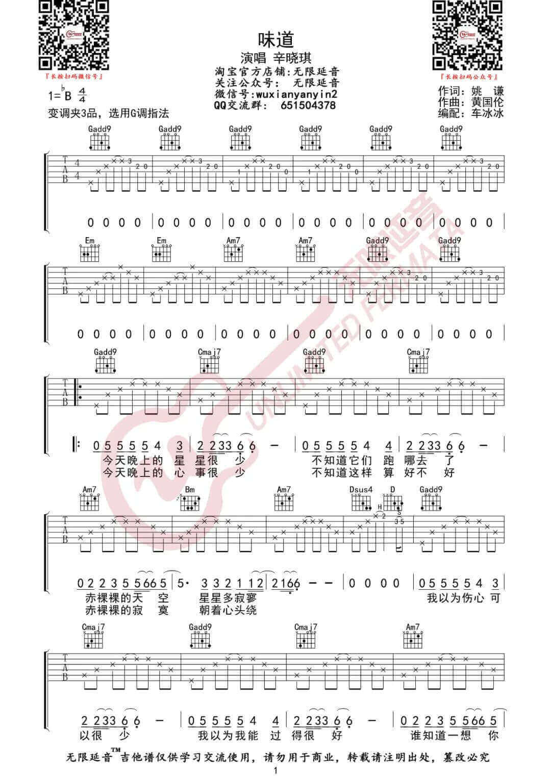 曲谱介绍: 味道吉他谱_辛晓琪_《味道》G调原版弹唱六线谱_高清图片谱分享,《味道》是由辛晓琪演唱的一首经典老情歌,也是辛晓琪的代表作之一。出道至今,辛晓琪凭借《领悟》、《味道》等经典情歌陪伴了一代人的成长。辛晓琪的歌淋漓尽致地诠释世间百态的爱情,总能把情歌唱得直抵人心,让听歌的男人女人一次又一次得以灵魂共鸣,人们总是能在她的歌曲里找到自己的故事,印证自己的爱情。