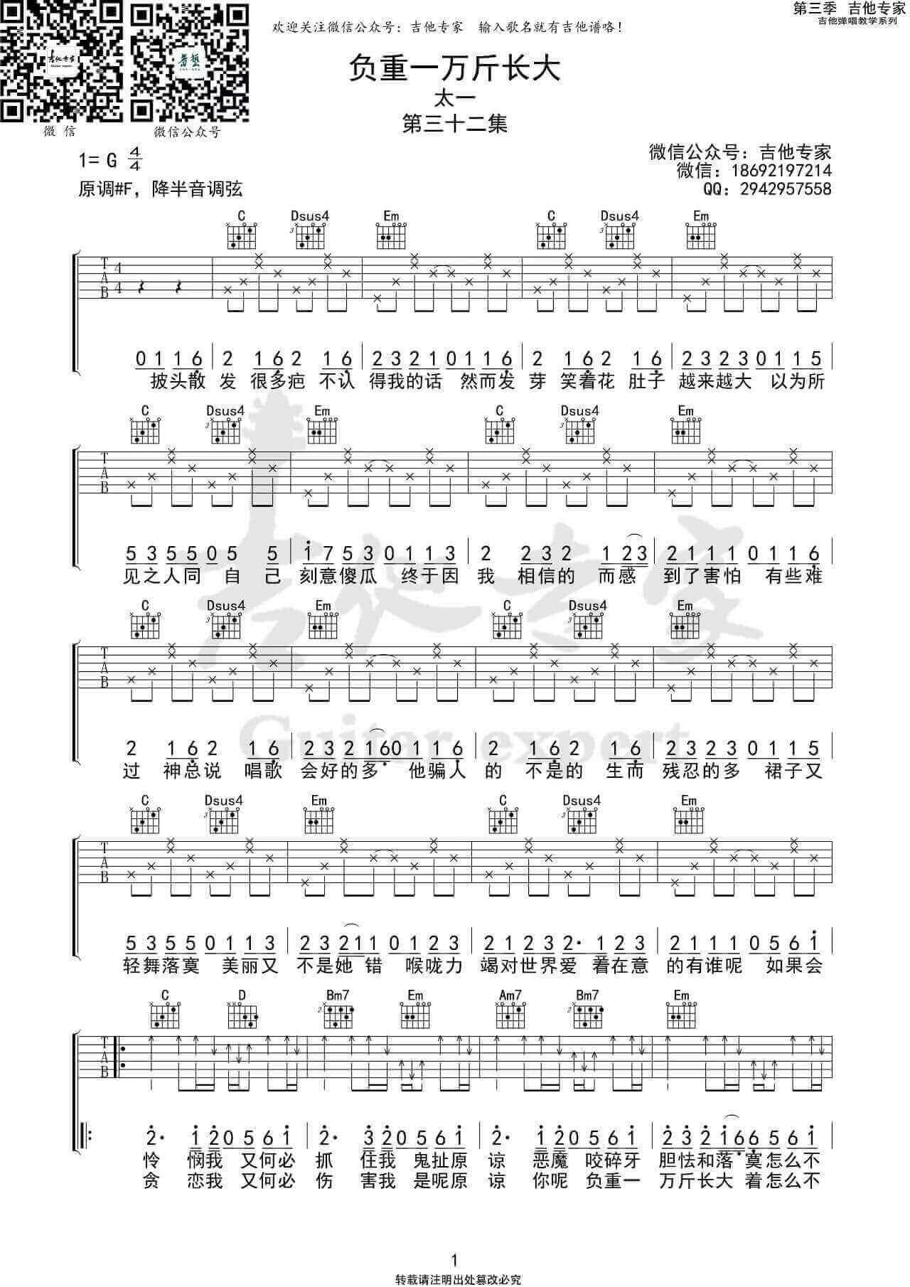 曲谱介绍: 《负重一万斤长大》吉他谱_太一_G调弹唱六线谱_高清图片谱分享,《负重一万斤长大》是由太一创作并演唱的一首歌,听说这首歌是他看完《素媛》所做。轻柔的控诉,情到深处的哽咽,稚嫩的童声,叩击心灵的词曲。